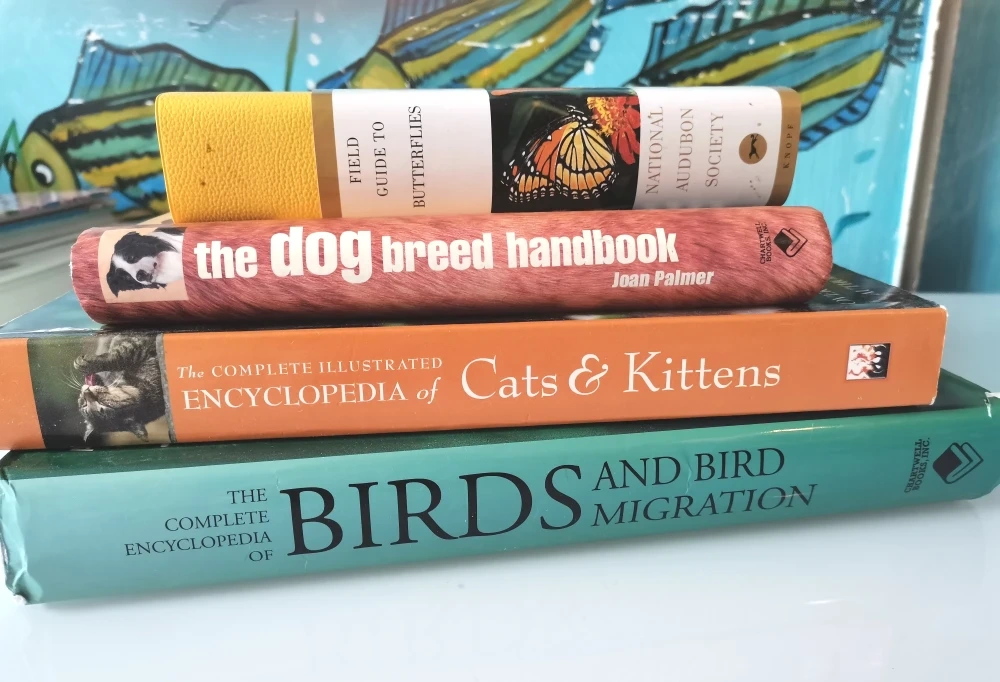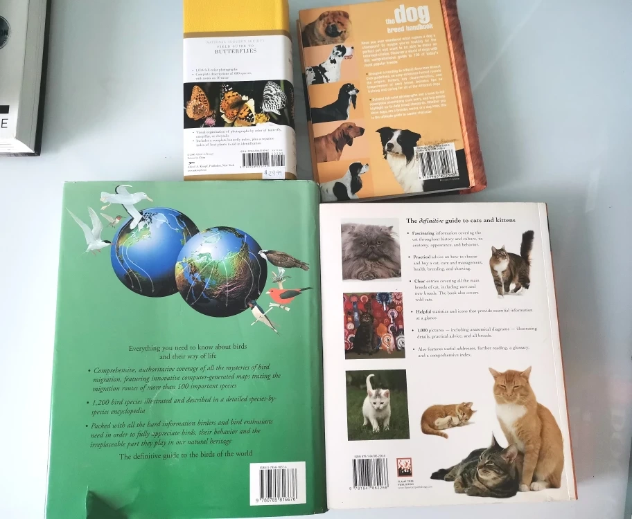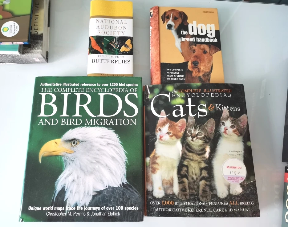 Collection of four informative books. Birds and bird migration encyclopedia. Field guide to butterflies from the National Audubon Society. Complete illustrated encyclopedia of cats and kittens. Dog breed handbook. Excellent condition.