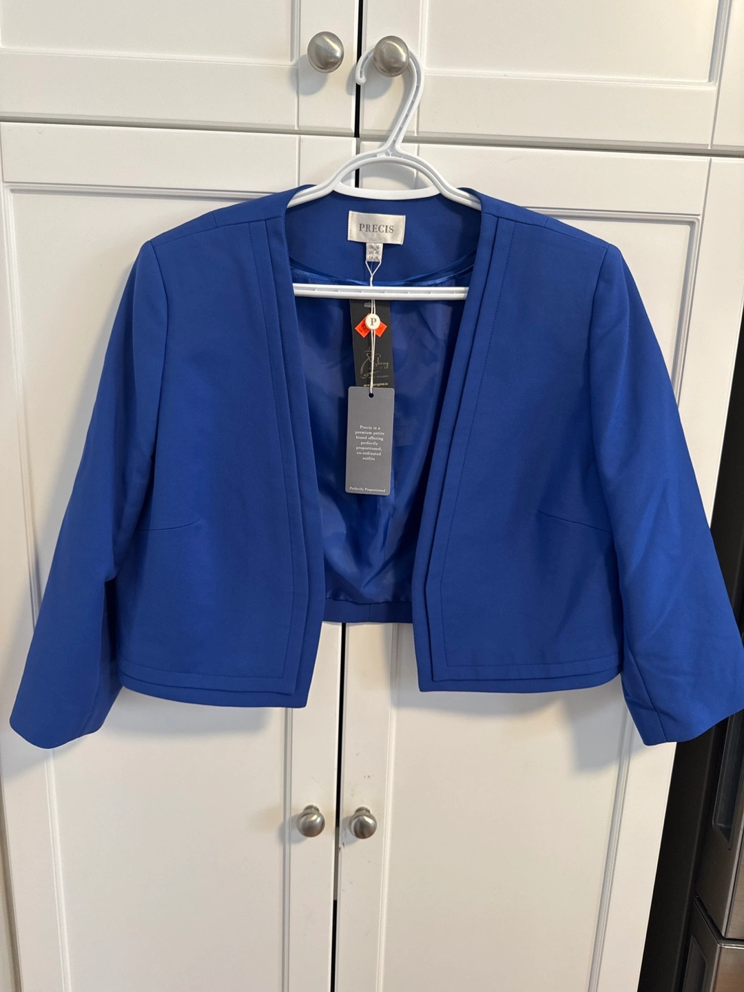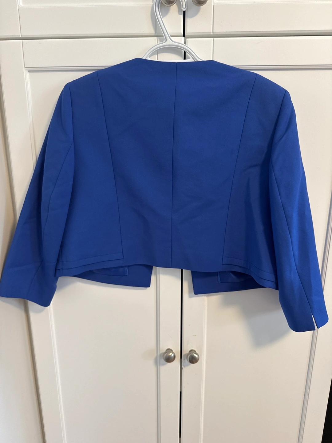 96Beautiful cobalt blue cropped bolero jacket. Three-quarter sleeves. Open front. Perfect for spring or fall. Excellent condition.