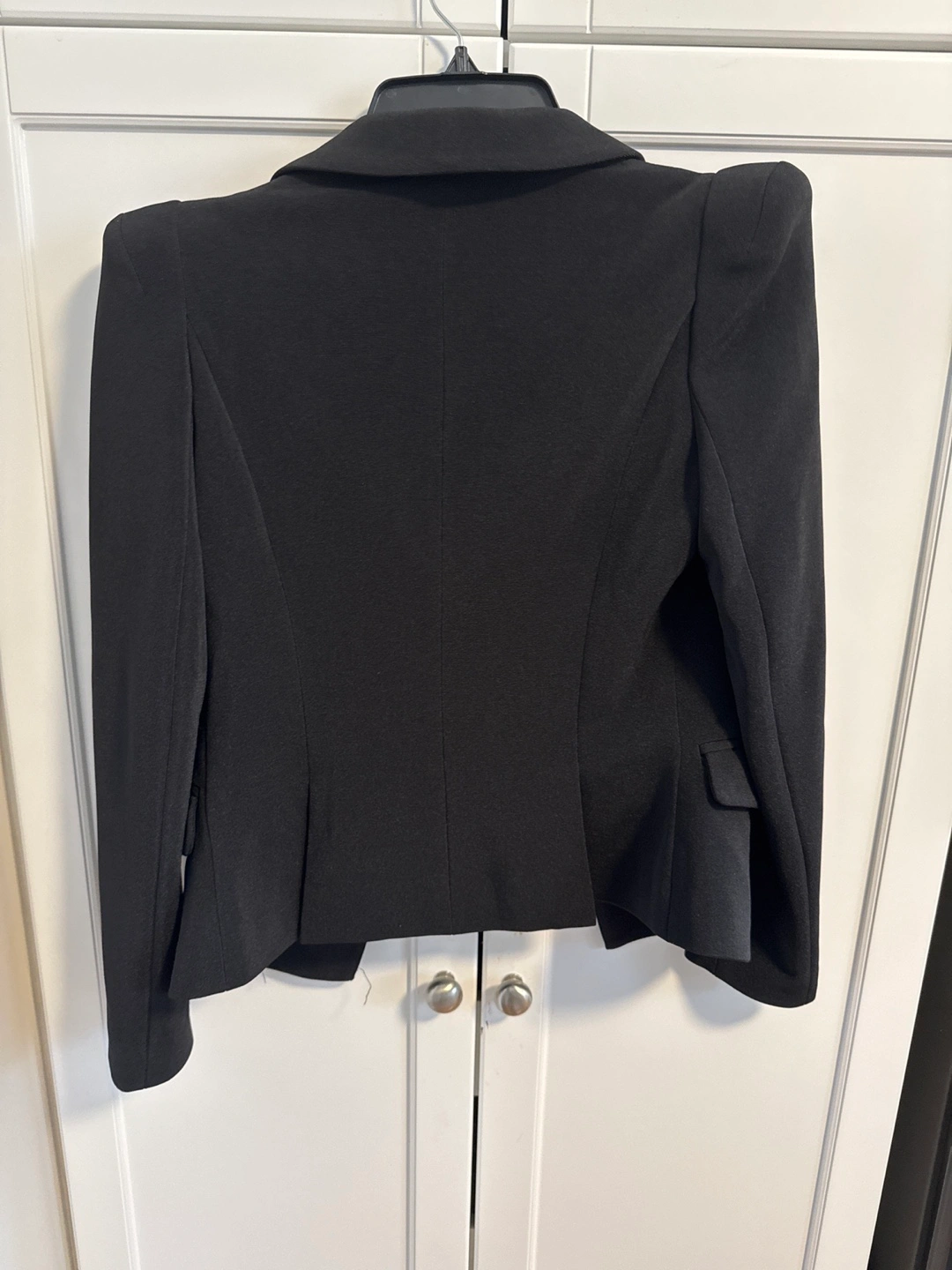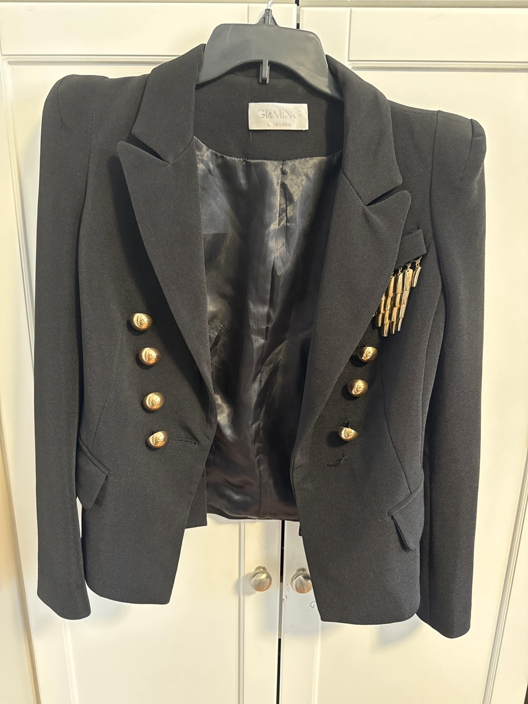 96Black blazer, gold buttons, puff shoulders, unique military-inspired detail. Size not specified.