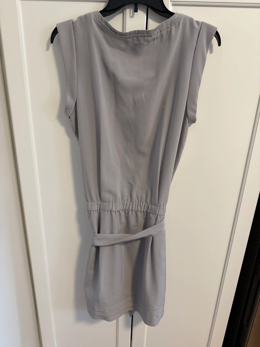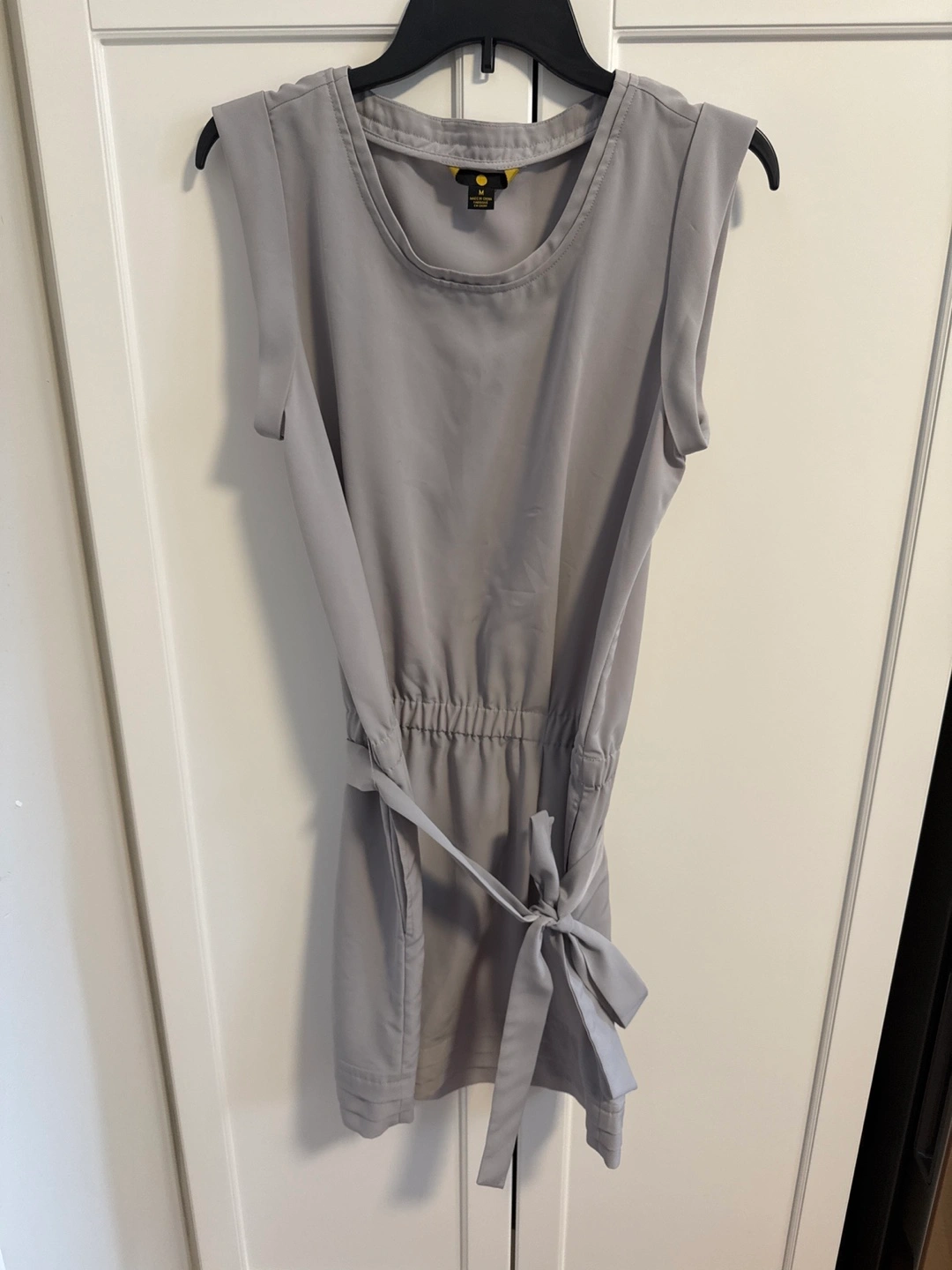 96Cute grey mini dress. Sleeveless with cap sleeves. Elastic waistband with a matching tie. Side pockets. Great for summer.