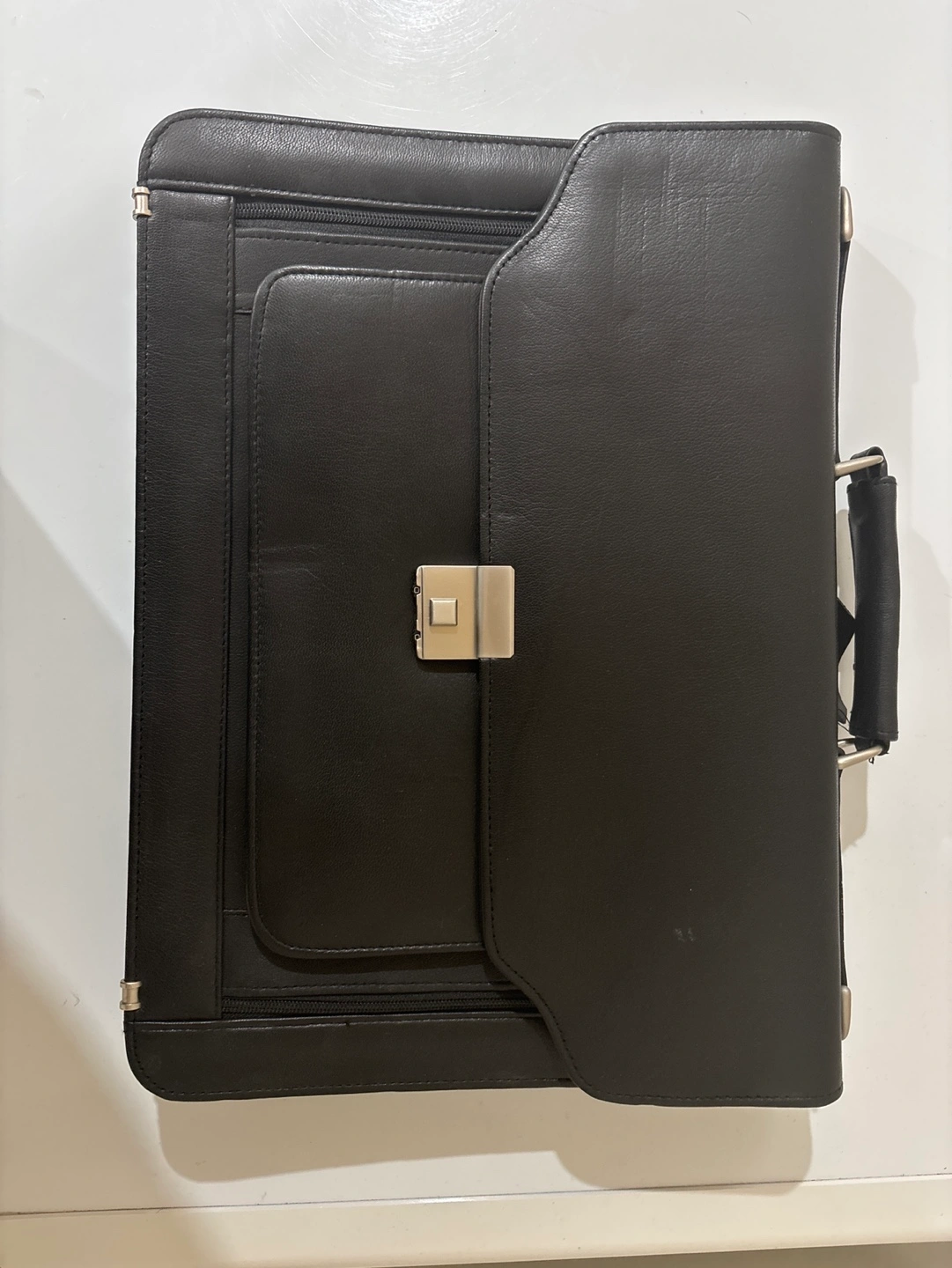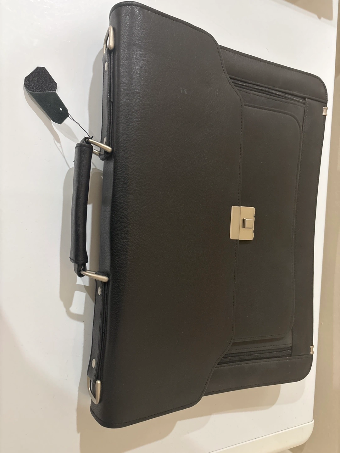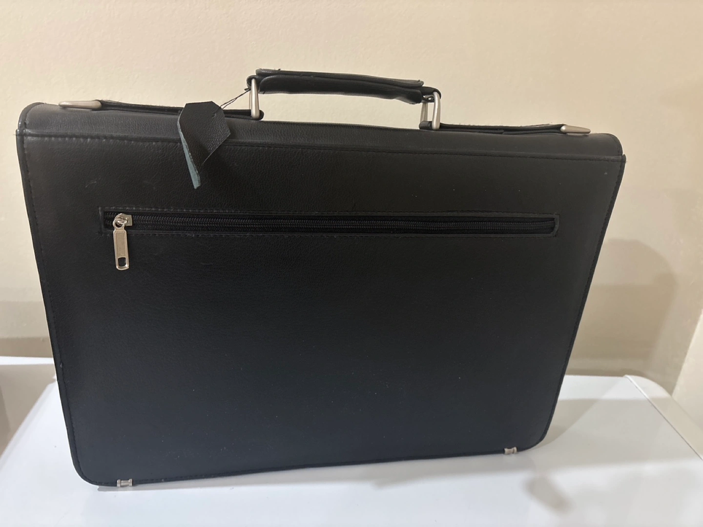 Professional-looking black briefcase. Features a top handle, multiple compartments, and a zipper closure. Suitable for work or travel. Excellent organizational features.