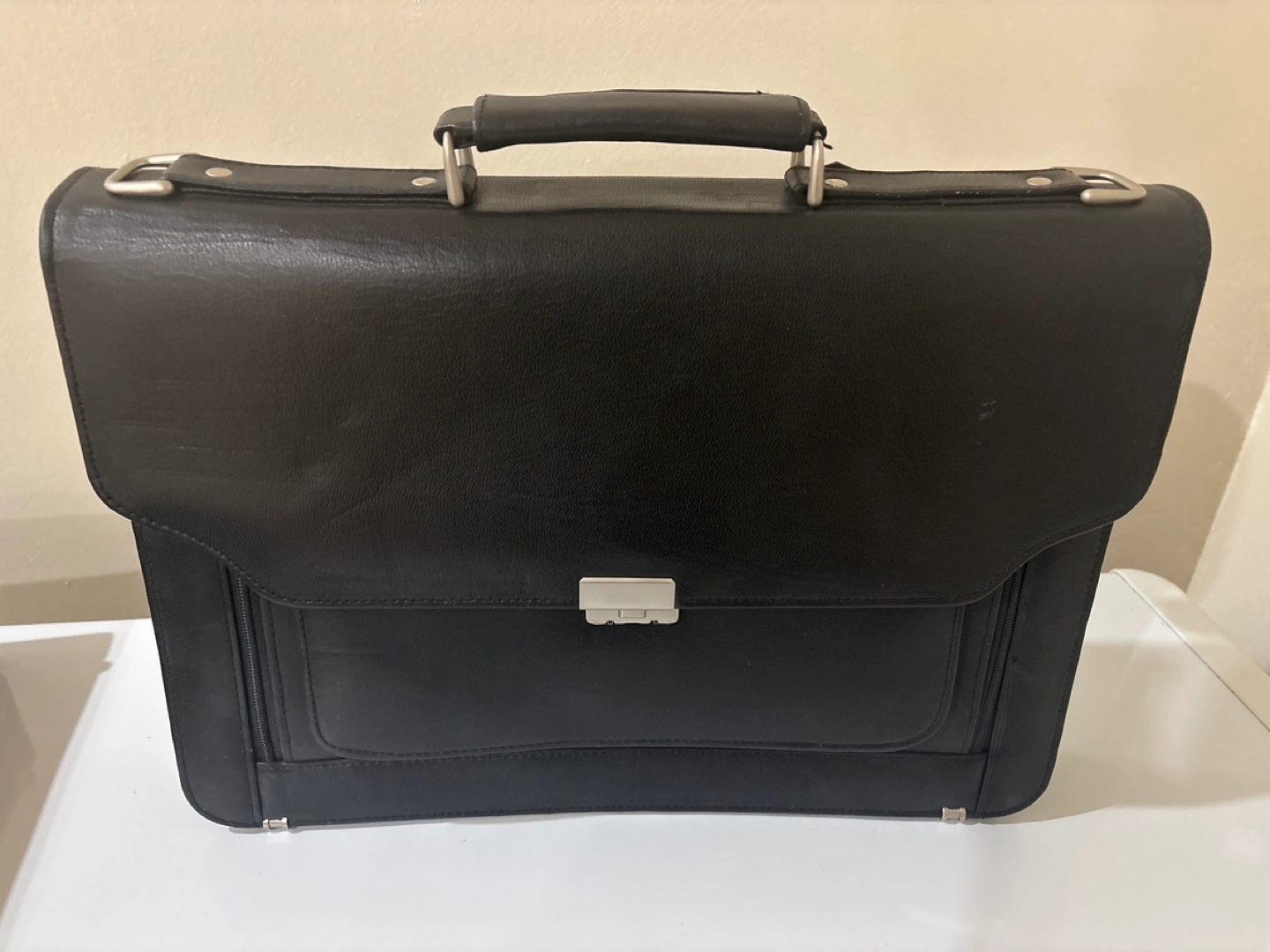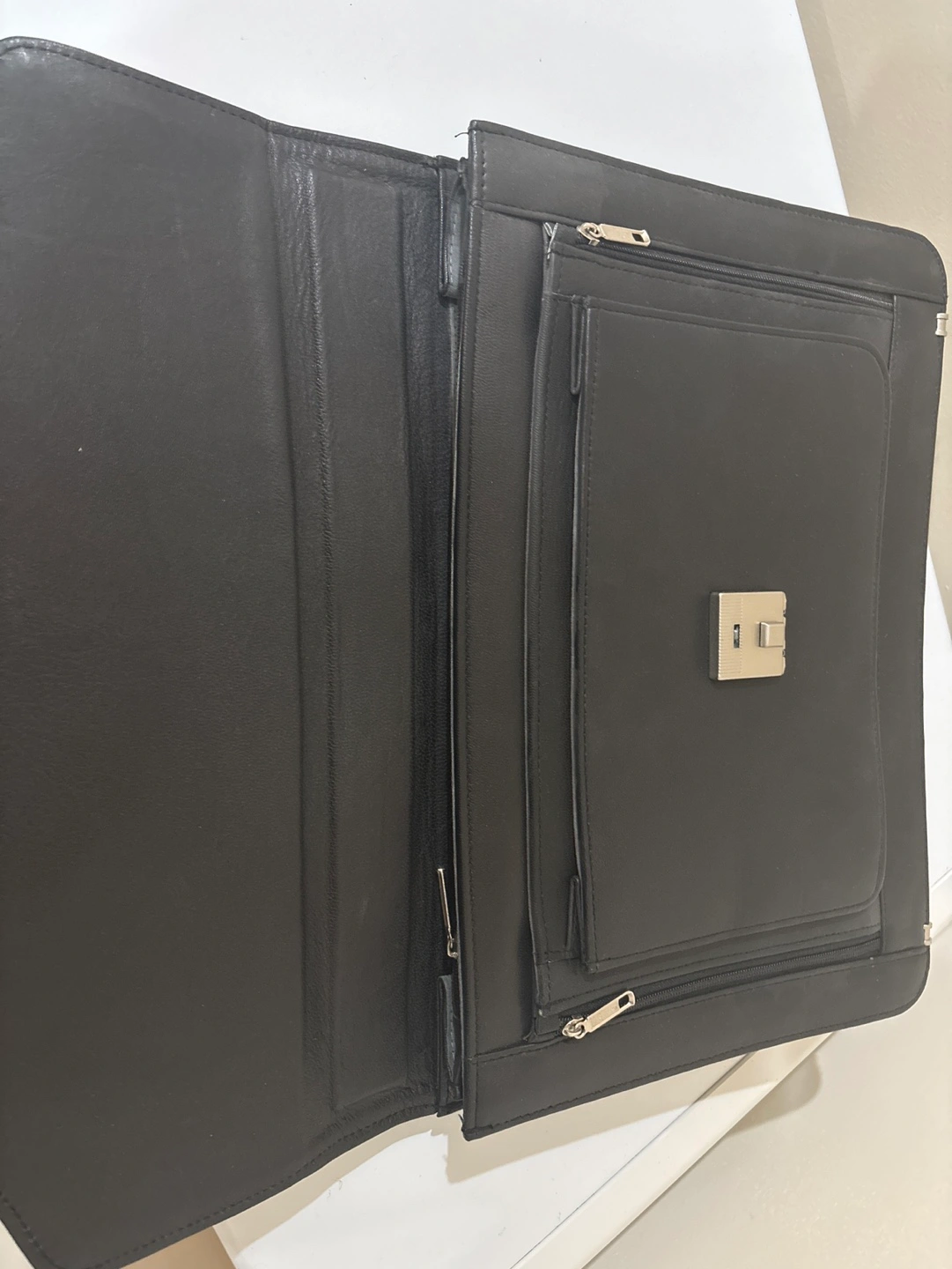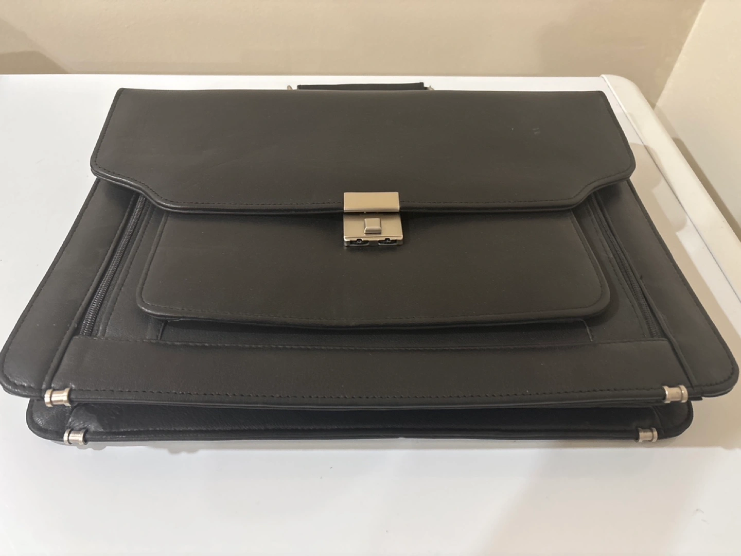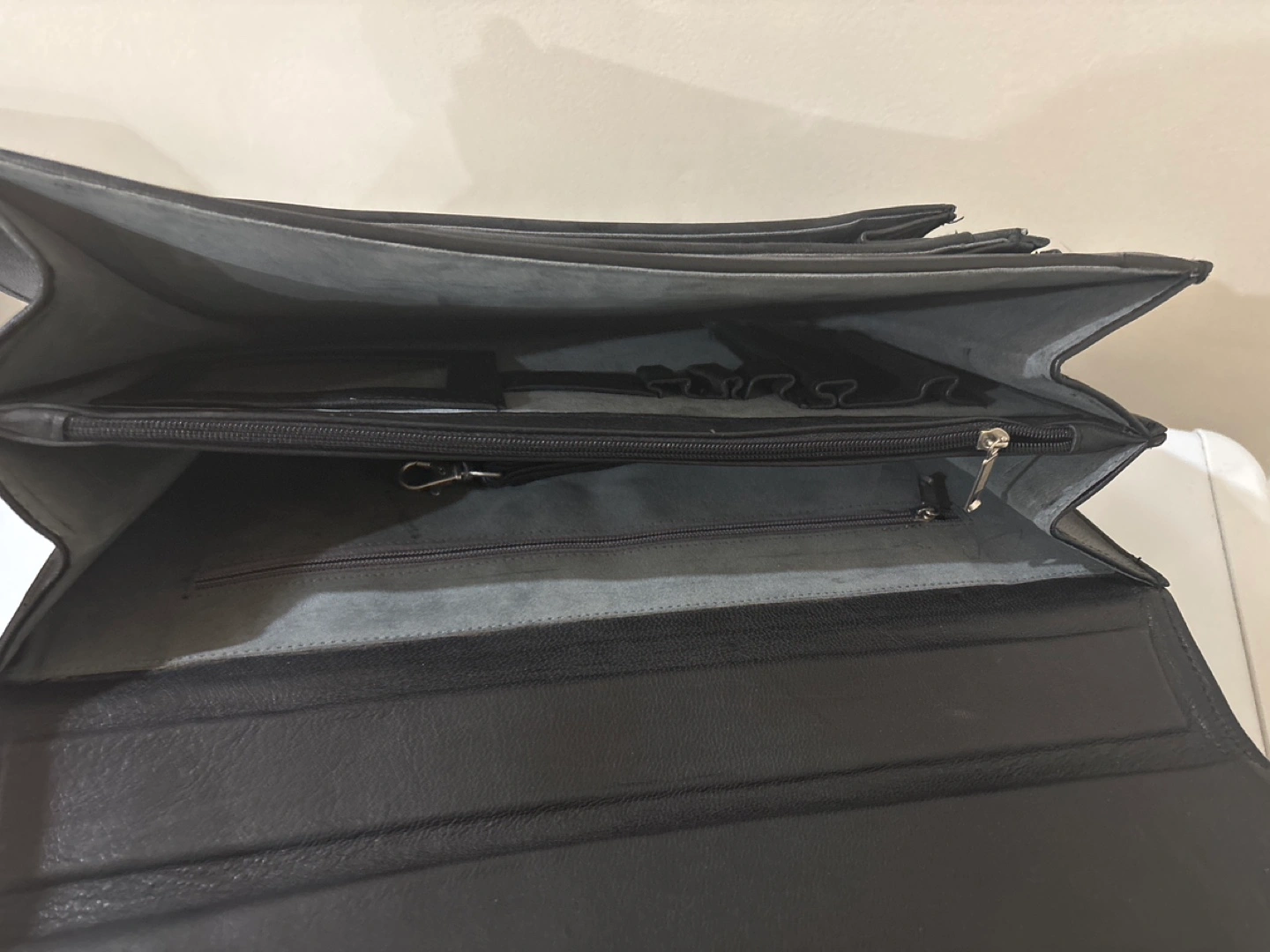 Professional-looking black briefcase. Features a top handle, multiple compartments, and a zipper closure. Suitable for work or travel. Excellent organizational features.