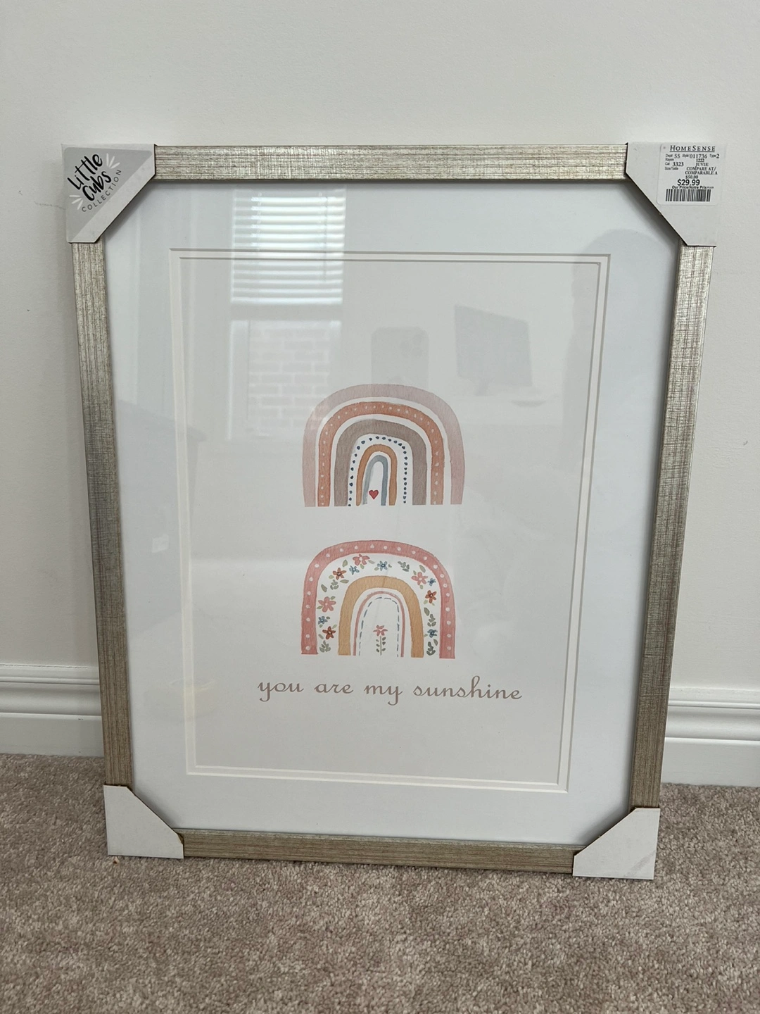 Cute framed print featuring two watercolour rainbows and the text "You are my sunshine". Silver frame. Perfect for a nursery or child's room. 17 inch W 21 inch L Porch pick up holland landing