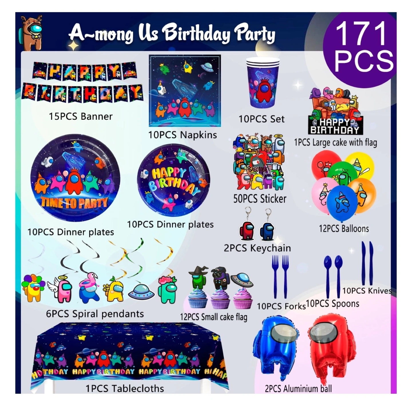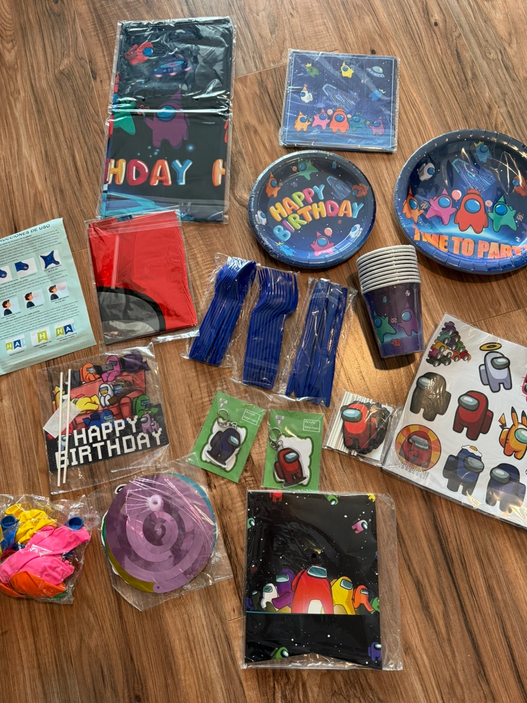 Huge Among Us party pack! Includes plates, napkins, cups, banner, balloons, cake topper, and more. Perfect for a birthday celebration. Everything you need for a fun party!