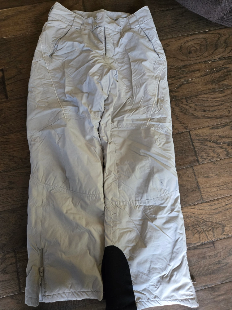 Light beige snow pants. Youth size 18/20. Black accents at the bottom. Zippered legs and waist. Good condition.