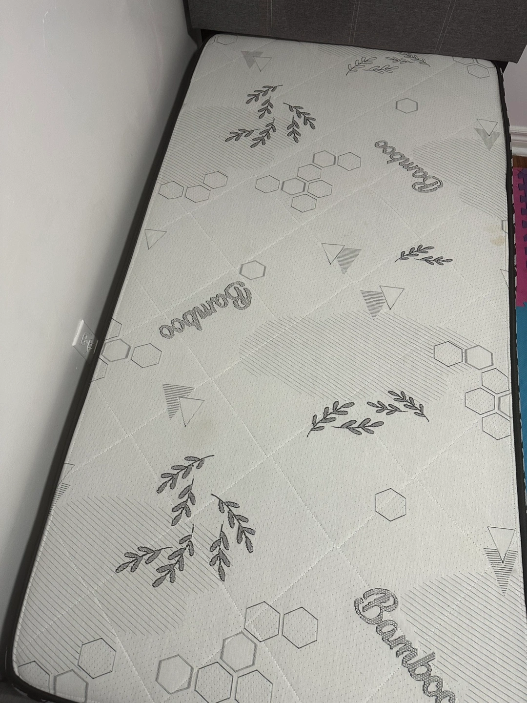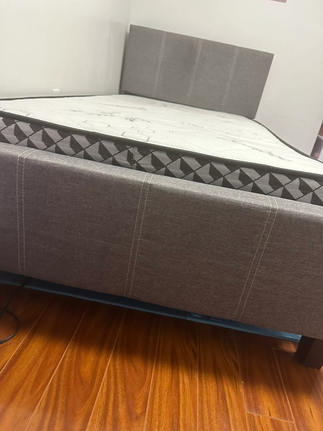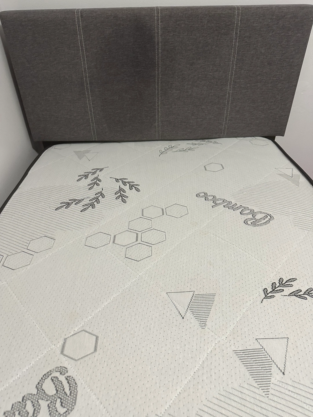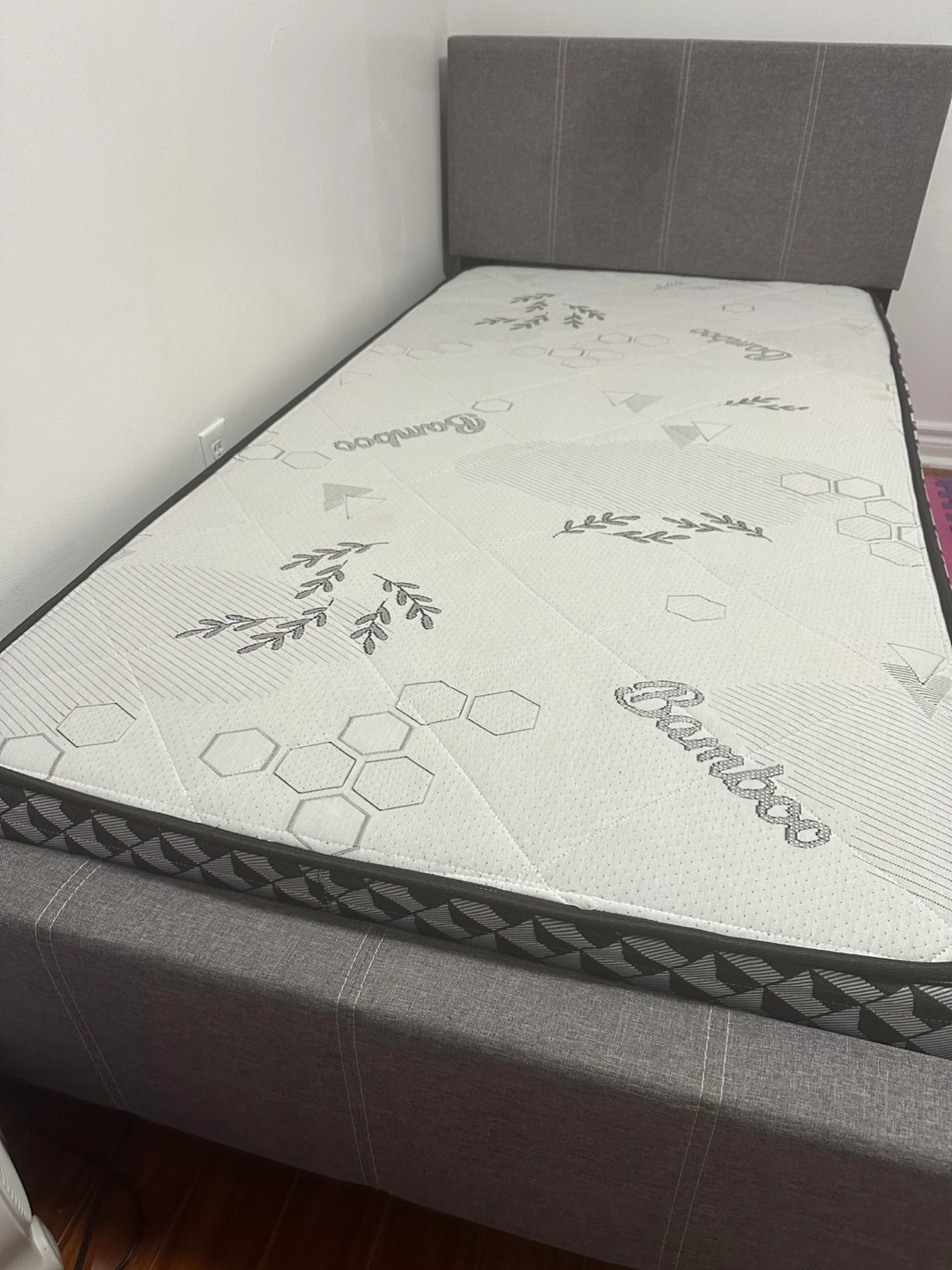 30PLATFORM BED LINEN STYLE FABRIC WITH ADJUSTABLE HEADBOARD - LIGHT GREY Features Adjustable Height HB (35" - 43") with Contrast Stitching Mattress Support Included (No need for box Spring) Twin (79"L x 41"W x 35" - 43"H) Colour- Light Grey Material- Linen Style Fabric ORTHOPEDIC DOUBLE-SIDED DELUXE MATTRESS – WHITE (MADE IN CANADA) Twin (74"L x 38"W x 9"H) Colour- White Material- Fabric & Spring