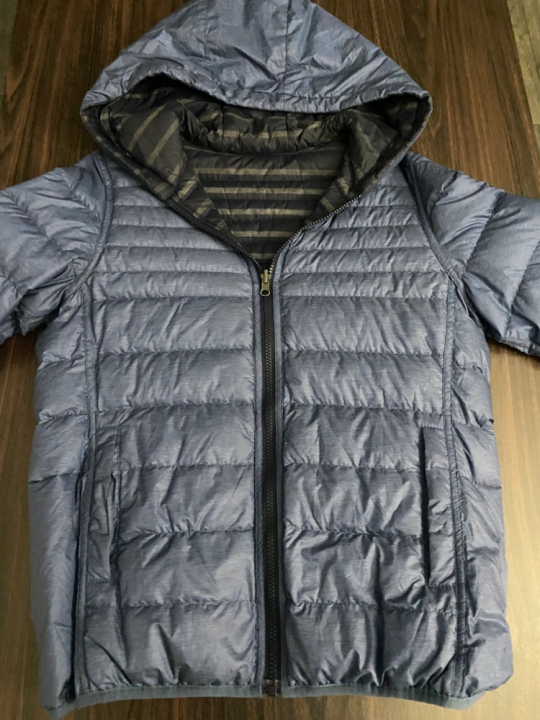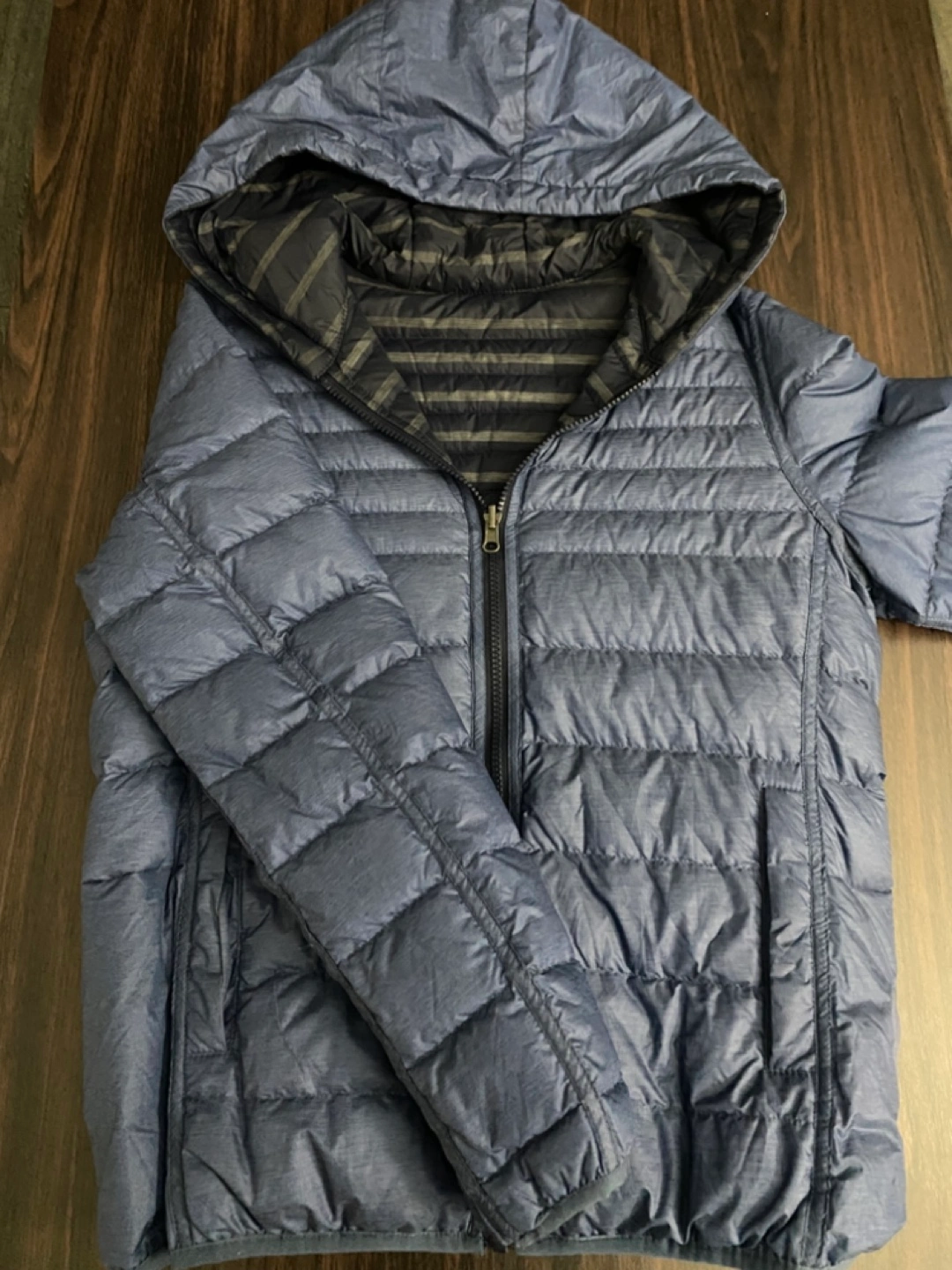 Reversible hooded jacket. Navy blue outer shell. Striped inner lining. Zip closure. Lightweight and packable into the size of your hands!
