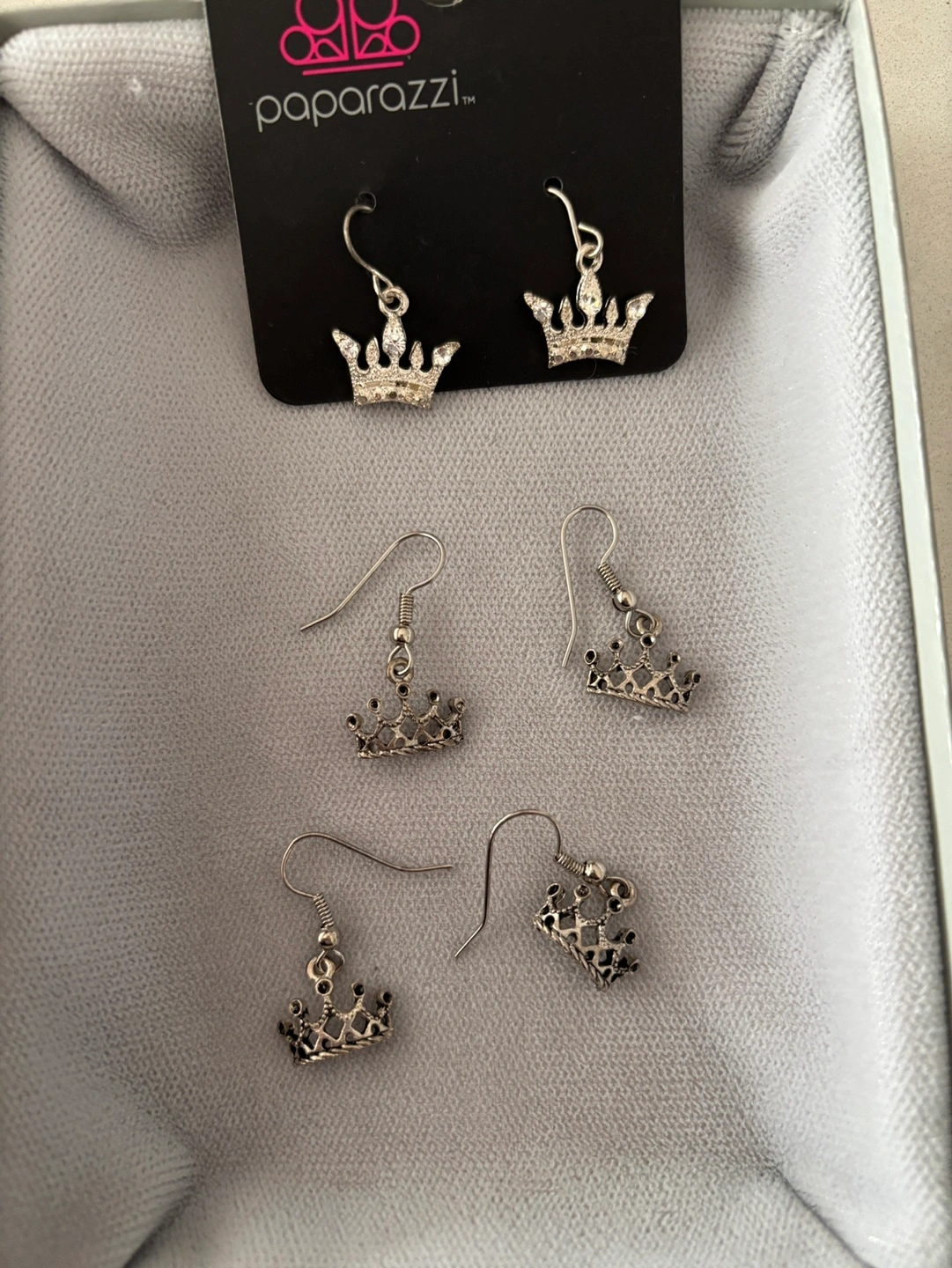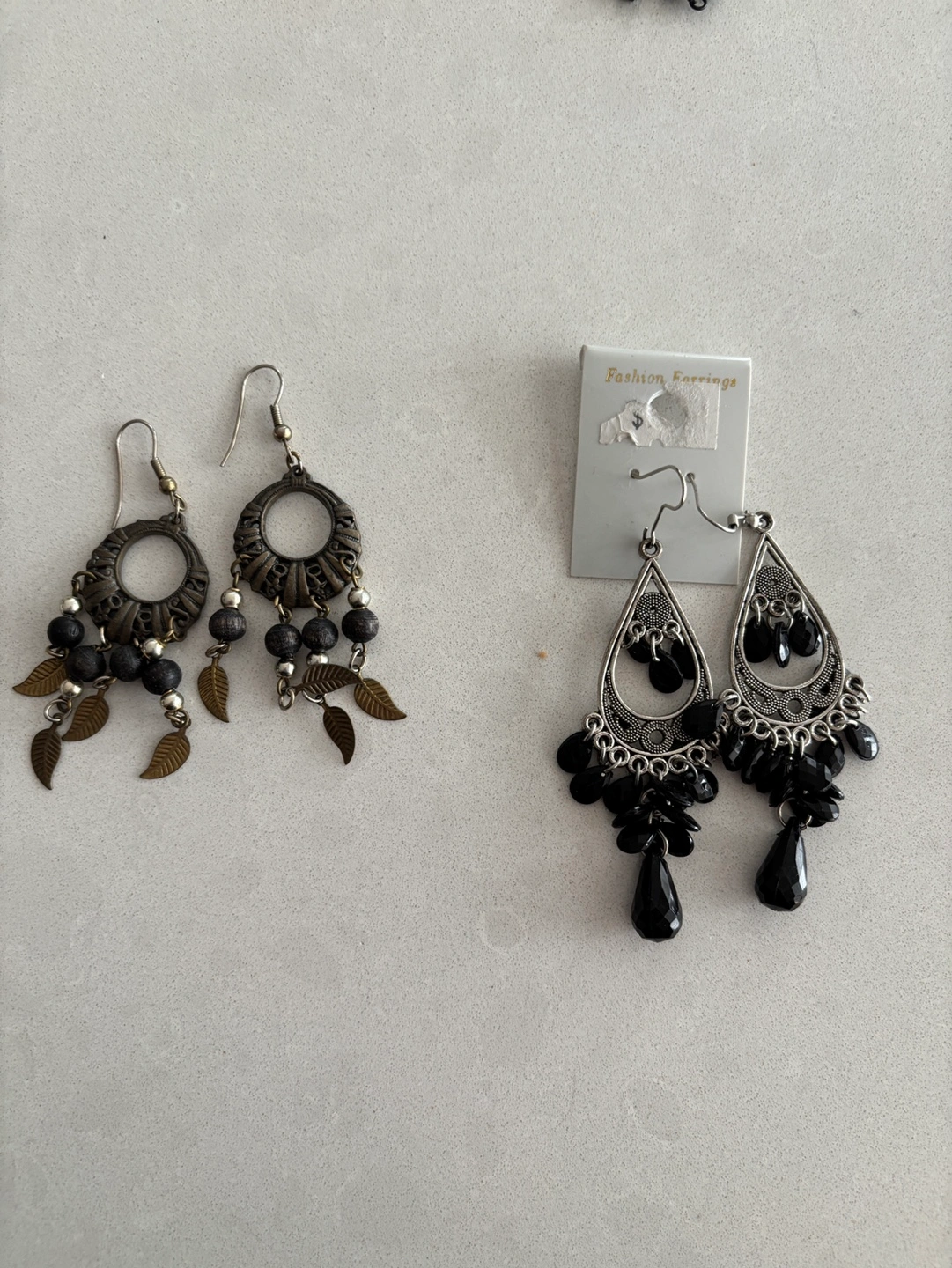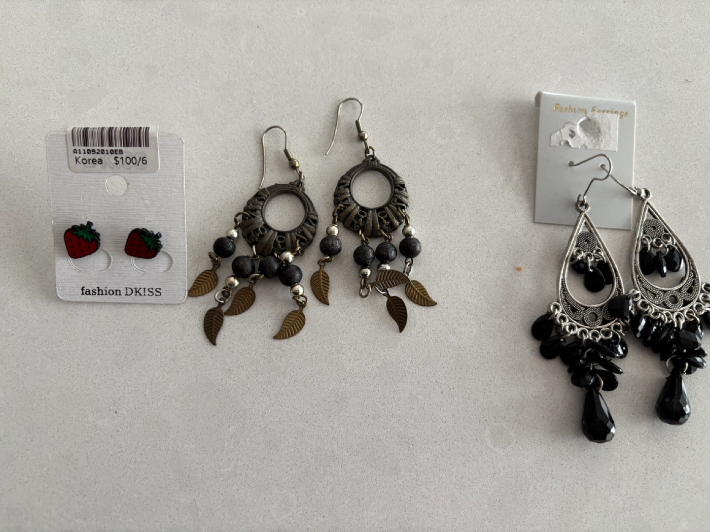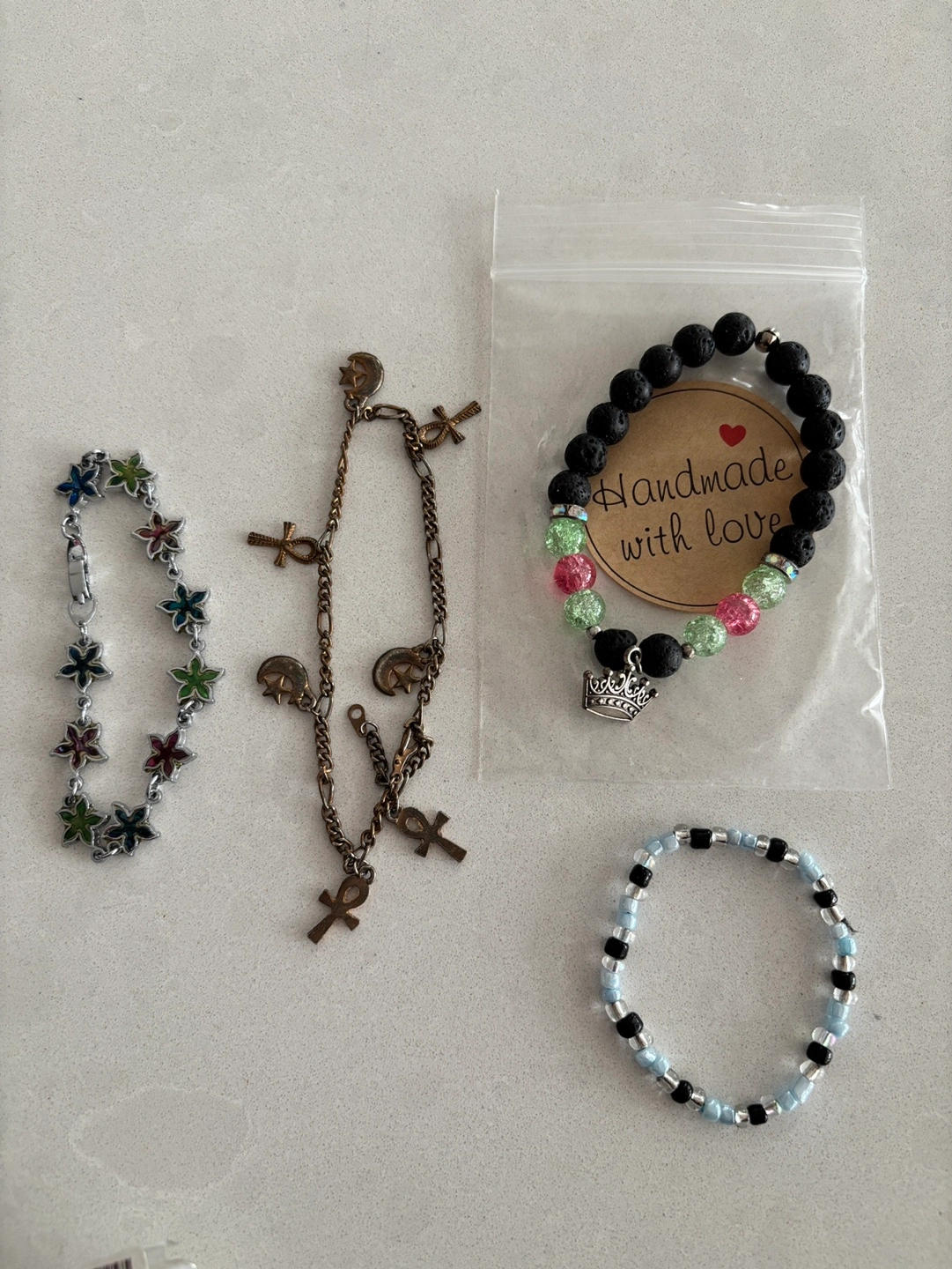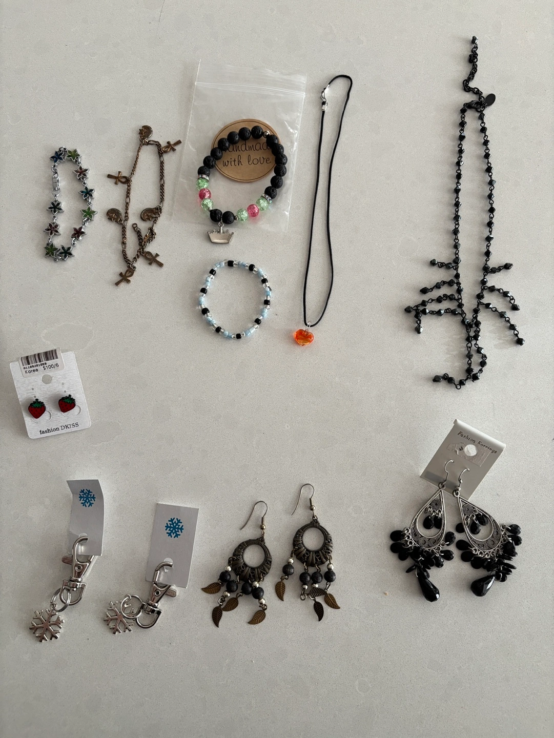 Some earrings, bags or charm clips snow flakes, bracelets, and some of the stuff has discoloured due to age and storage.
