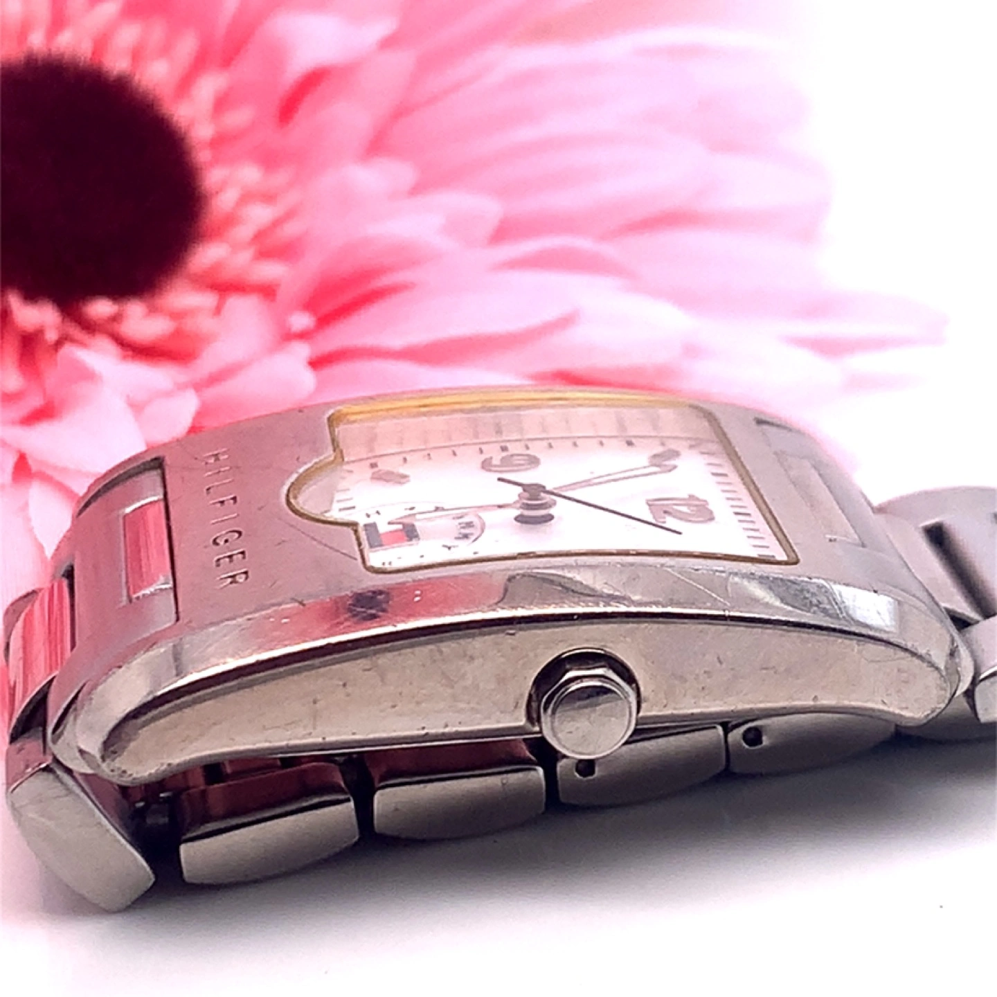 Pre-owned Tommy Hilfiger men’s watch. Features a stainless steel band and case. Square face. Quartz movement. There’s scratches on the metal.