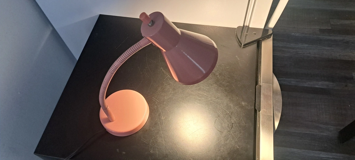 Pink desk lamp. Gooseneck design. Great for studying or adding a pop of colour to your space. Lightbulb included. On/off switch on top.