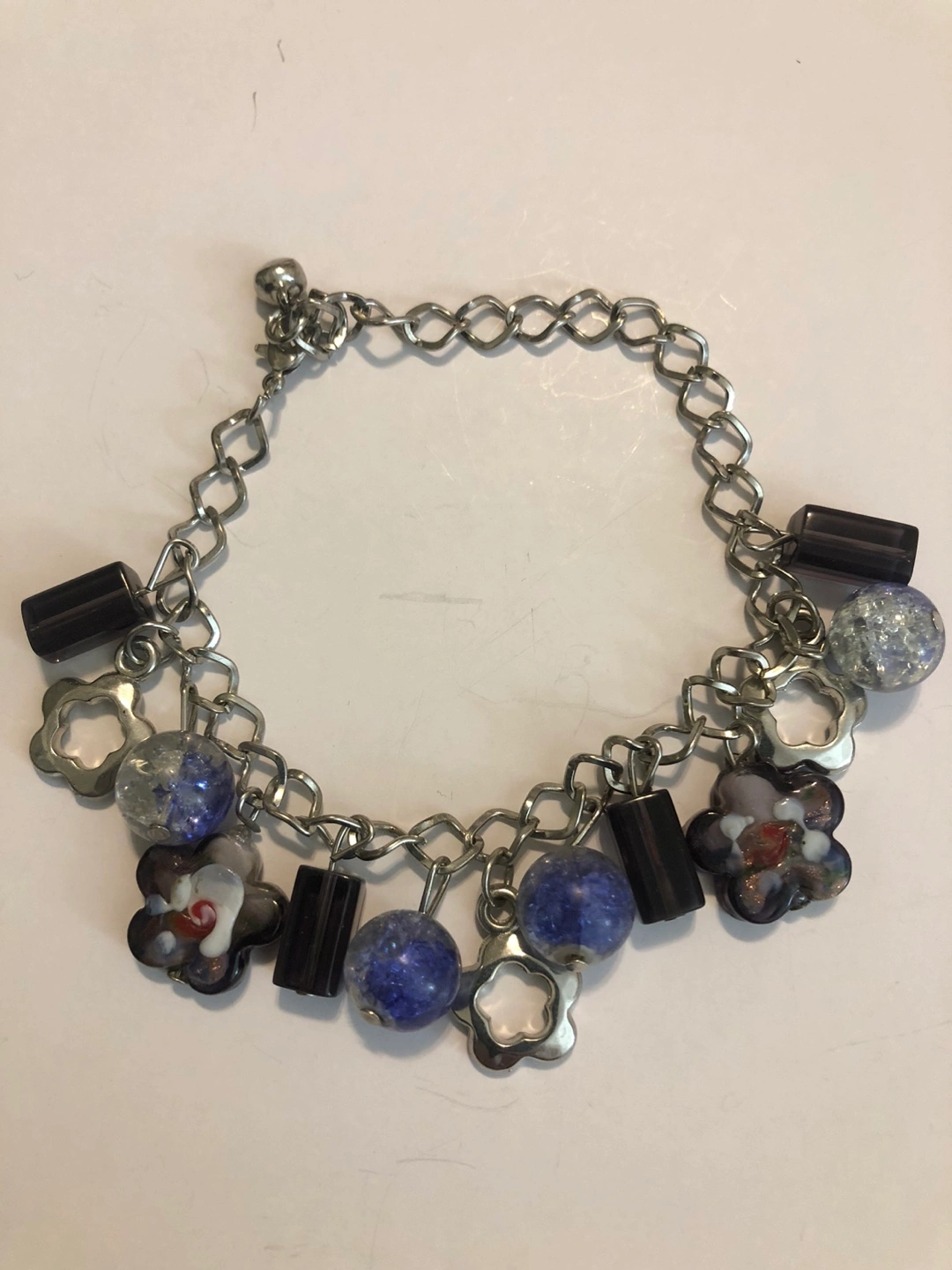Silver chain bracelet. Features various charms including flowers, sparkly beads, and rectangular accents. Blue and purple color scheme.