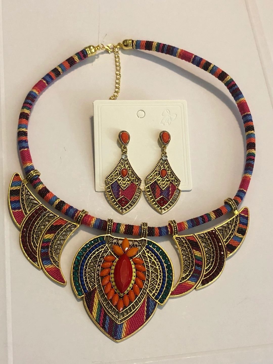 Colorful necklace and earrings set. Multicolored fabric cord necklace with large ornate pendant. Matching drop earrings. Gold-tone metal accents. Bohemian style.