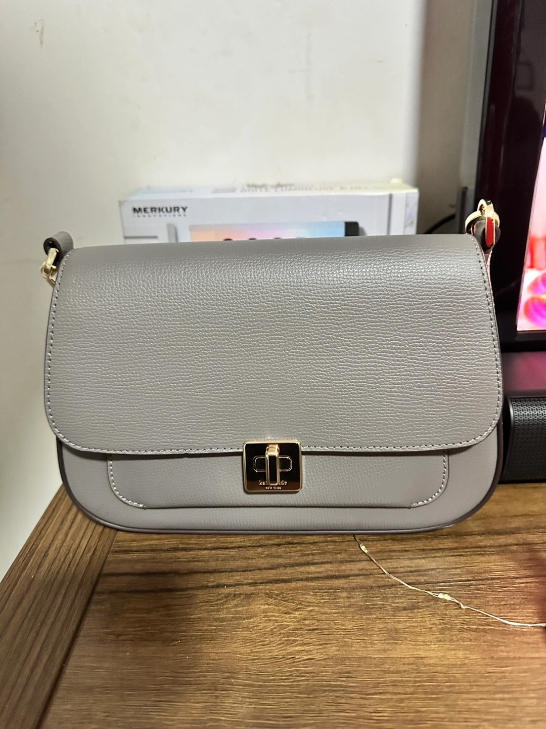 Grey leather crossbody bag. Small flap closure. Gold-tone hardware. Chain and leather shoulder strap. Interior pocket. Sold out at Kate Spade Outlet.