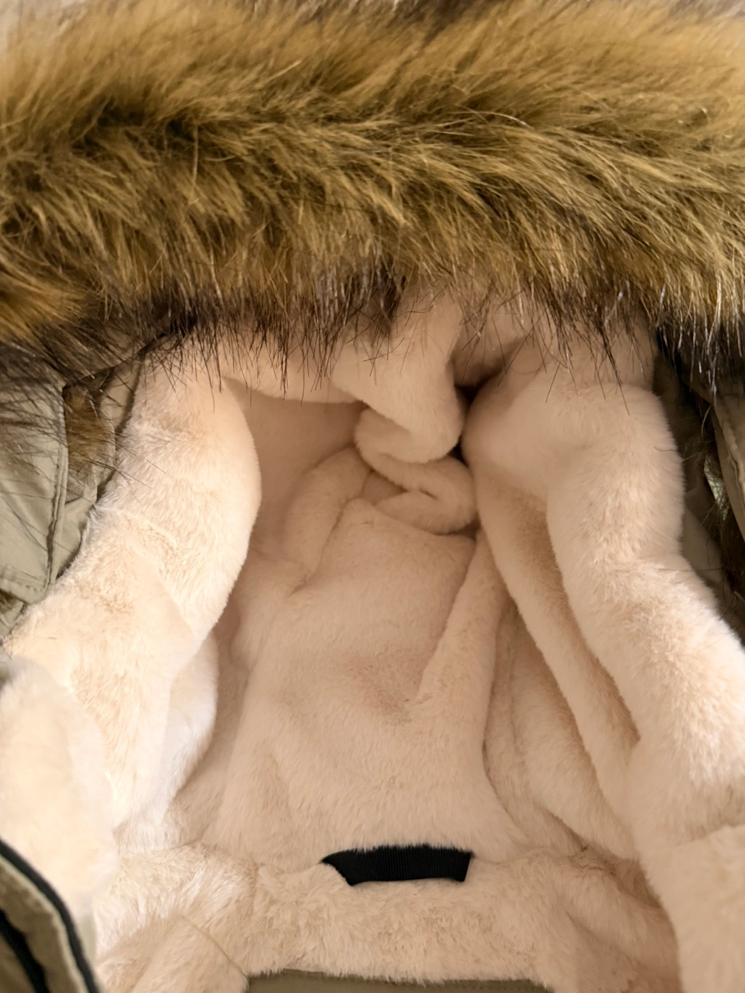 Women's size XS puffer jacket. Features a faux fur trimmed hood, fleece lining, and zippered pockets. Recycled fill and machine washable. Wind and water resistant.