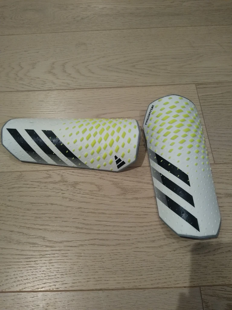 Adidas Predator soccer shin guards with black protective sleeves included.