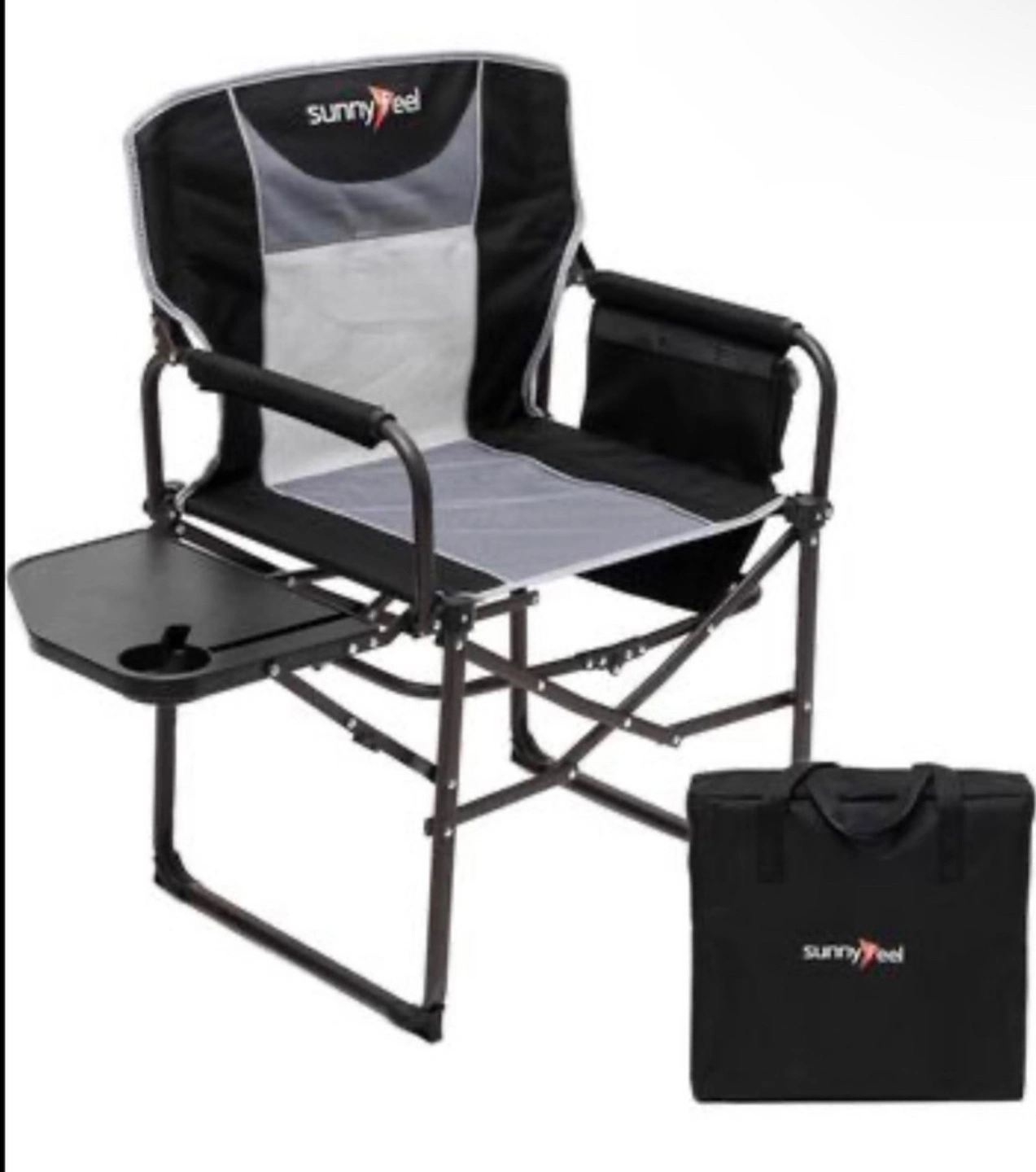 •Portable folding chair, black and grey fabric. •Includes side tray and carrying bag.