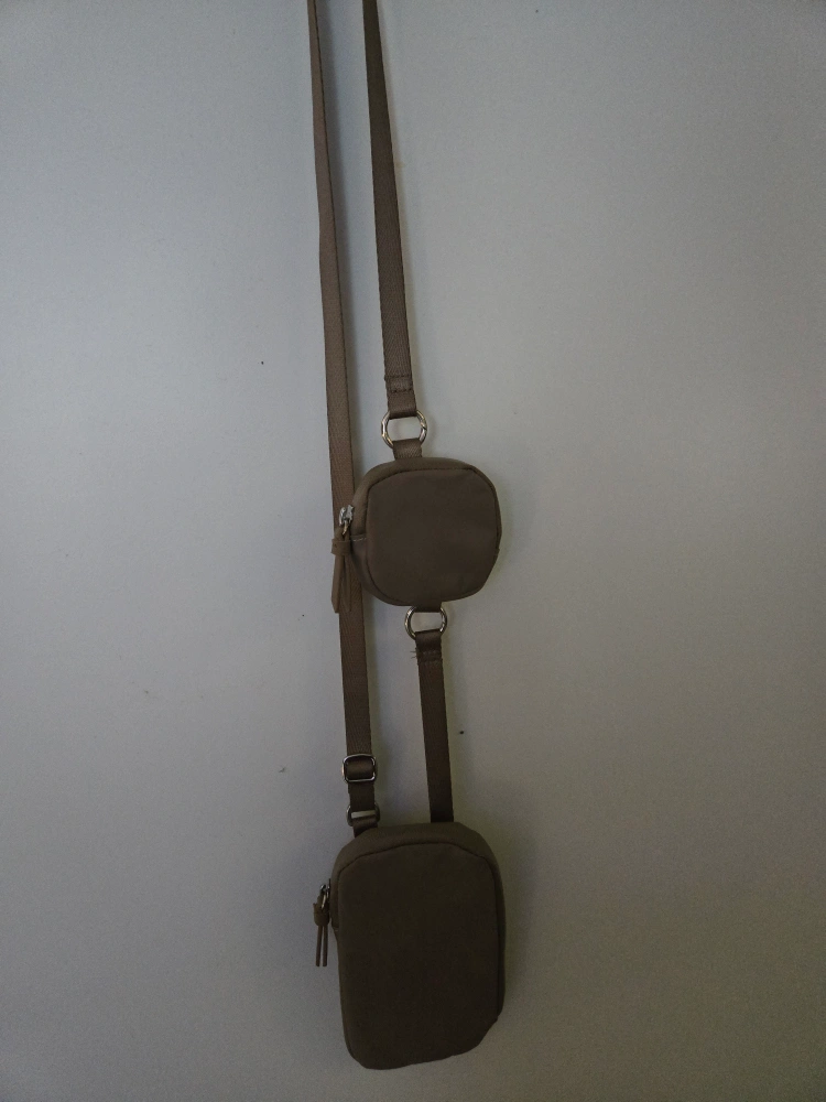 Two-piece taupe crossbody bag. Features two zippered pouches connected by straps. Small and compact. Perfect for everyday use. Has a change purse. Great for cellphone,cards and change. maybe your favorite lips loss π
