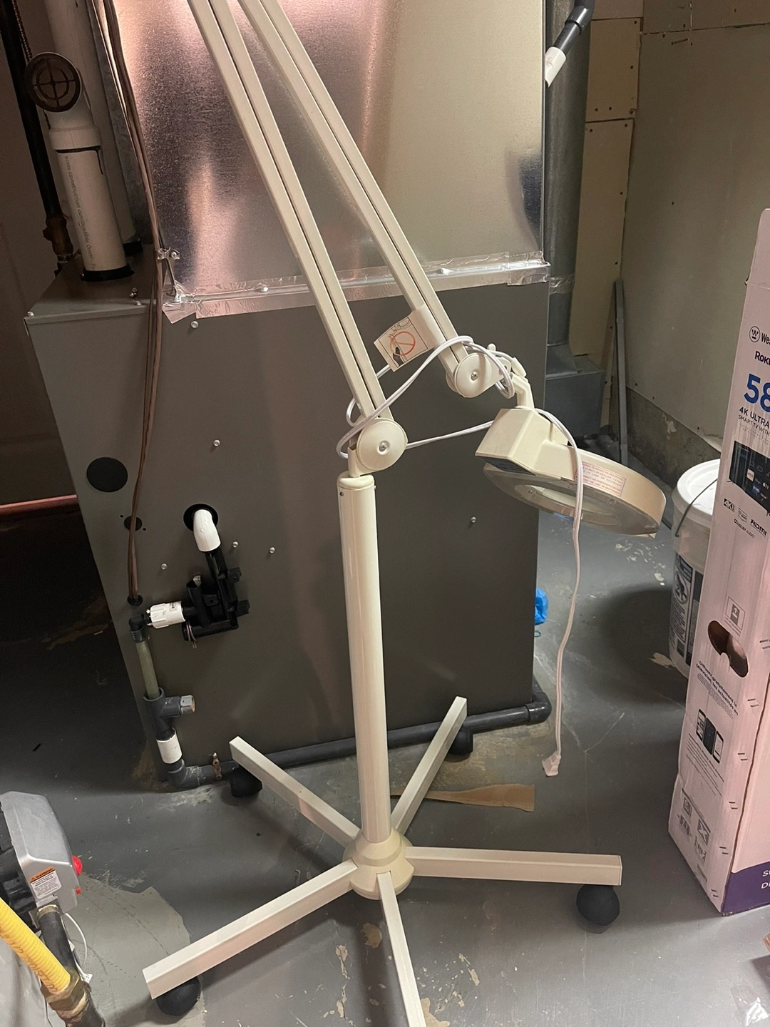 Adjustable floor lamp with magnifying glass. Good condition. White metal frame. Six-leg base. Ideal for close-up work in spas and aesthetics.