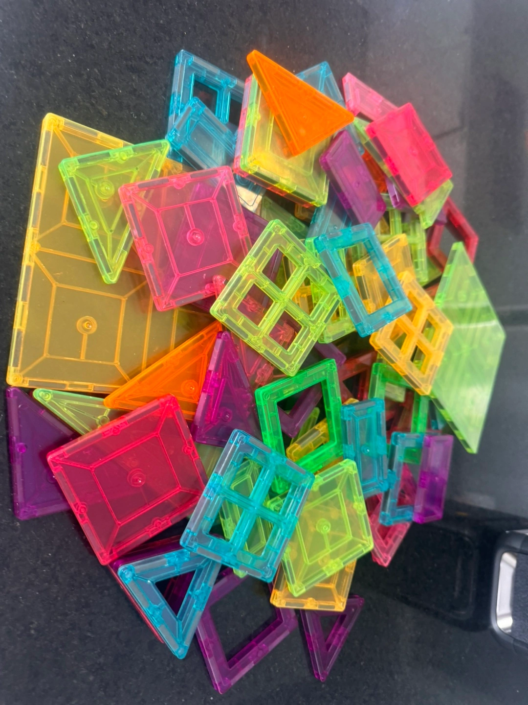 Large collection of colourful magnetic tiles. Various shapes and sizes included. Great for imaginative play and STEM learning. Fun for kids of all ages.