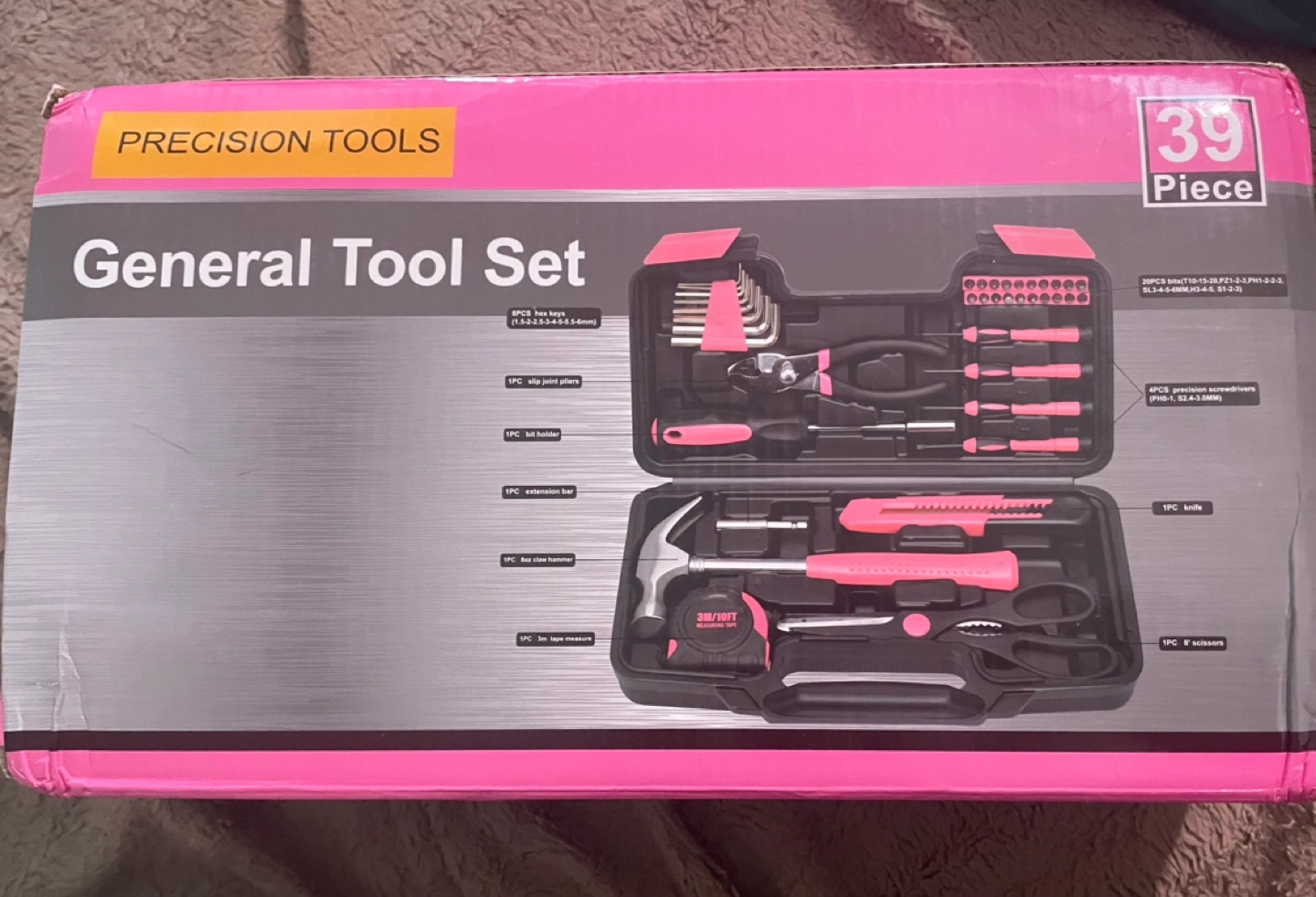 New general tool set, 39 pieces. Includes hex keys, pliers, screwdrivers, hammer, tape measure, and more. Pink accents on many tools. Comes in a carrying case. BNIB.