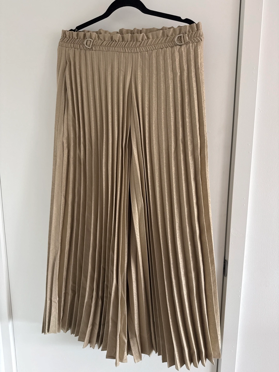 96Gold pleated culottes. High-waisted with a tie waist. Lightweight fabric. Excellent condition.