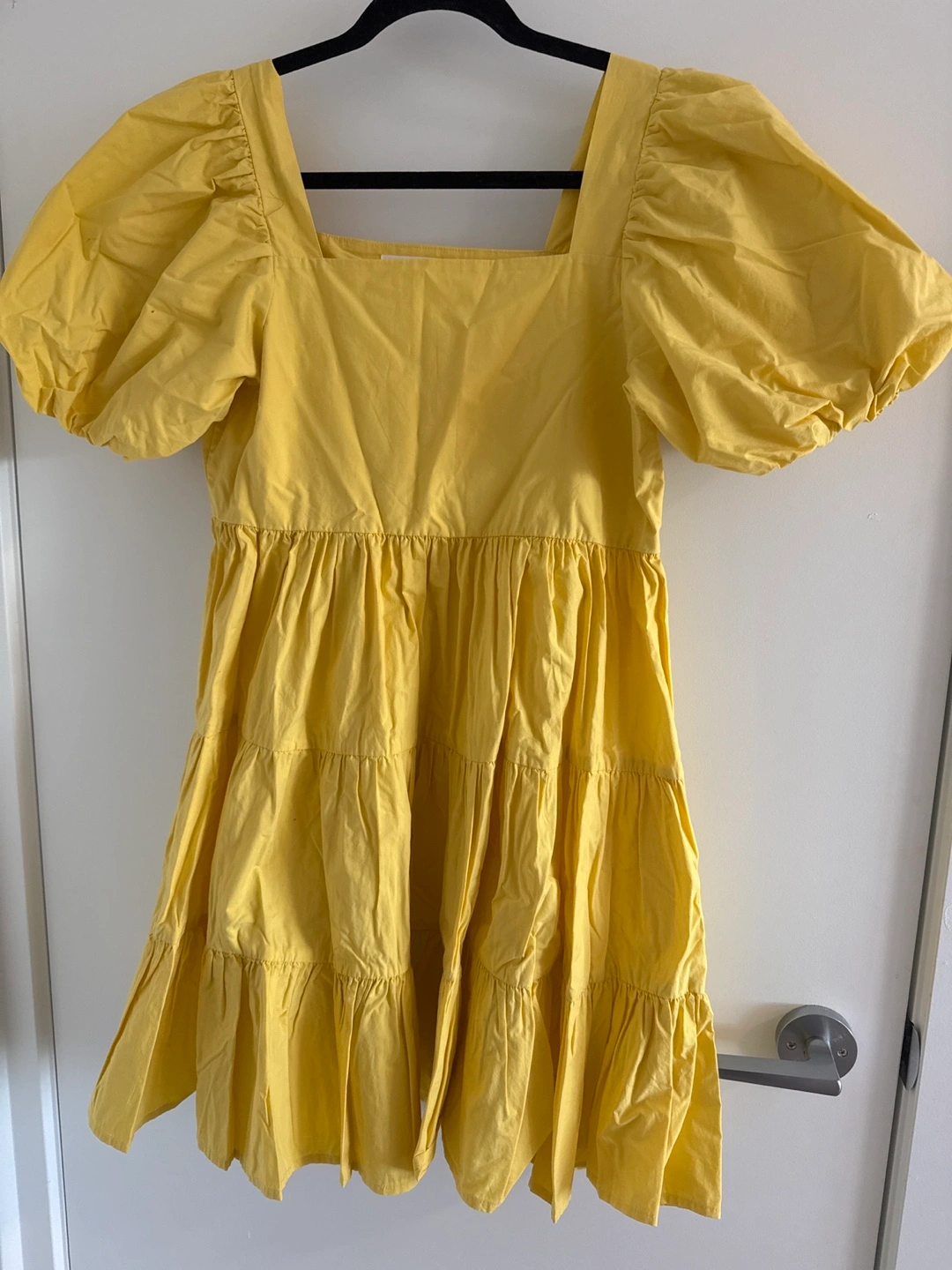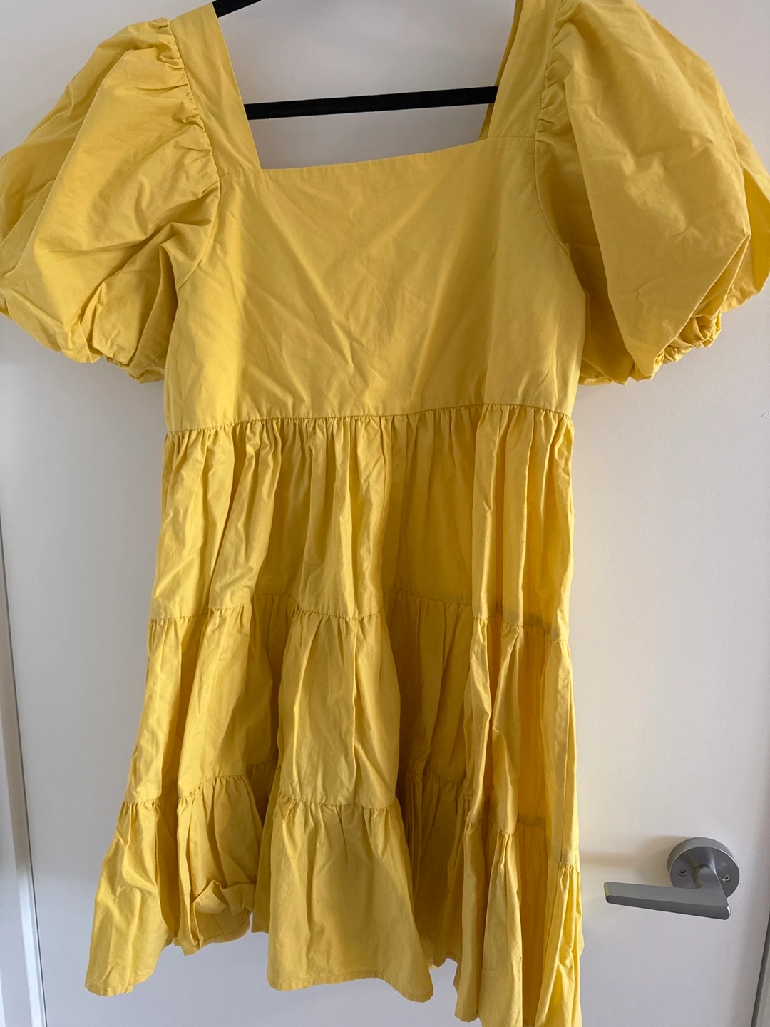 96Adorable mini dress. Mustard yellow colour. Puff sleeves. Tiered skirt. Square neckline. Size small.