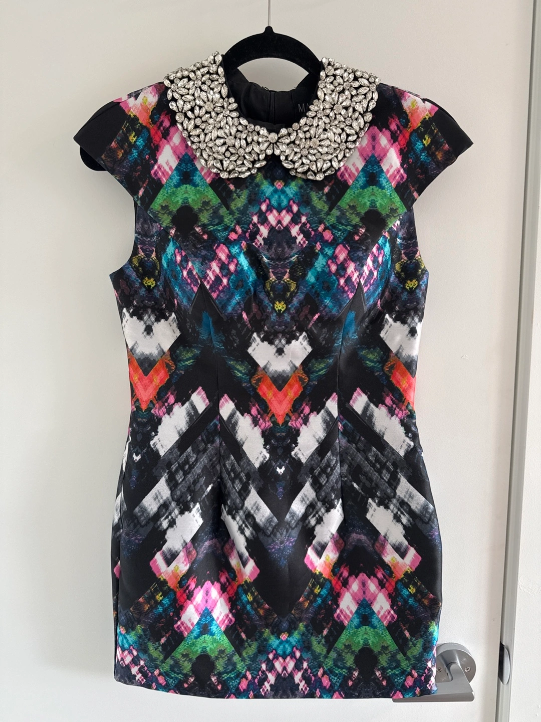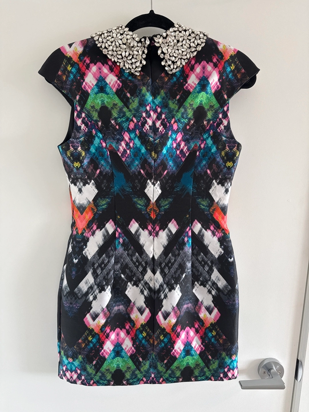 96Stunning Maslavi mini dress. Size 4. Cap sleeves. Vibrant colourful print. Embellished jewel neckline. Polyester. Dry clean only.