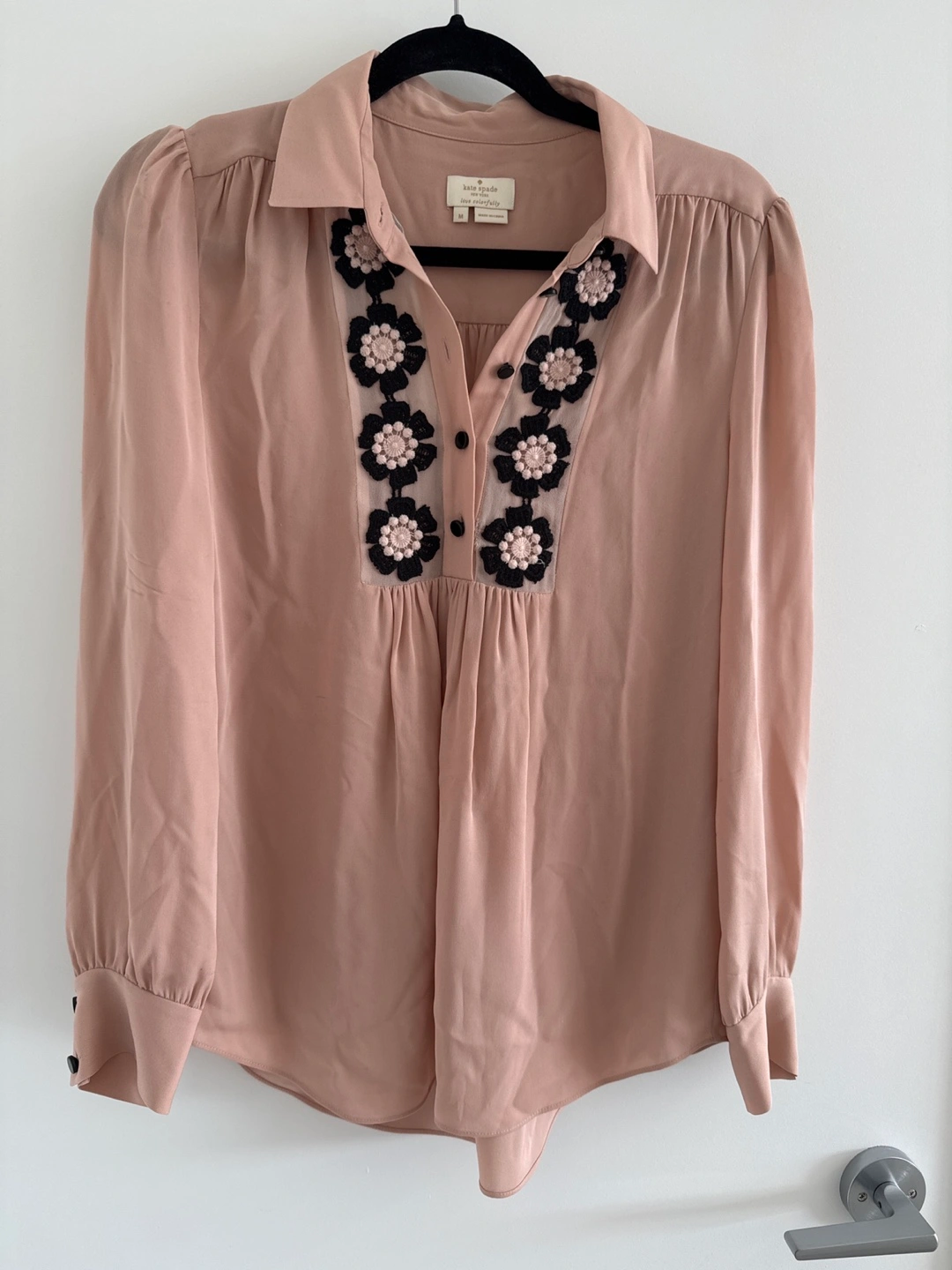 96Beautiful blush pink blouse. Features long sleeves, button-down closure, and delicate floral embroidery. Size medium. Made in China.