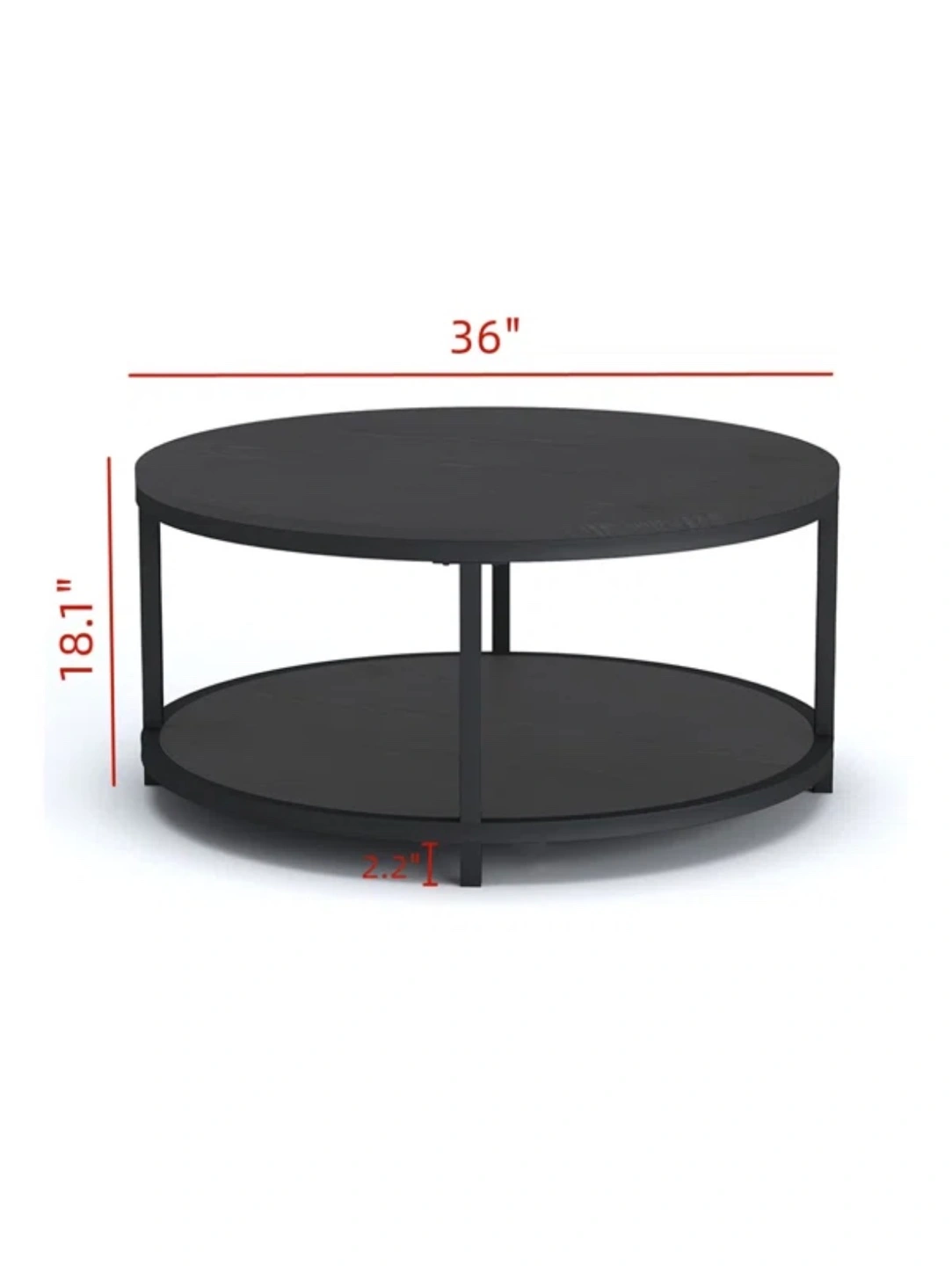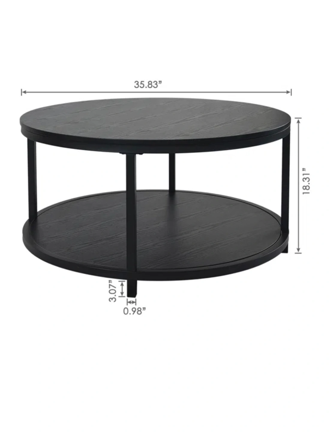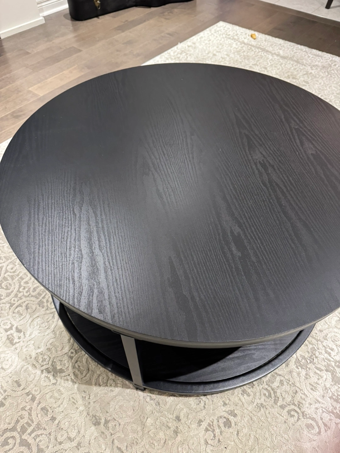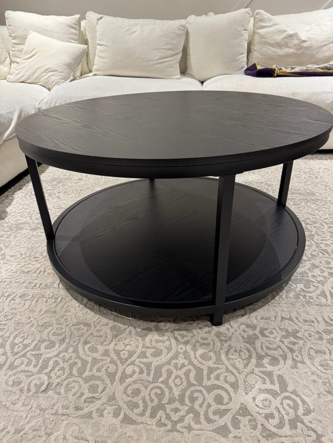 Stylish round coffee table. Features a lower shelf for storage. Black finish. Modern design. Excellent condition. BNIB