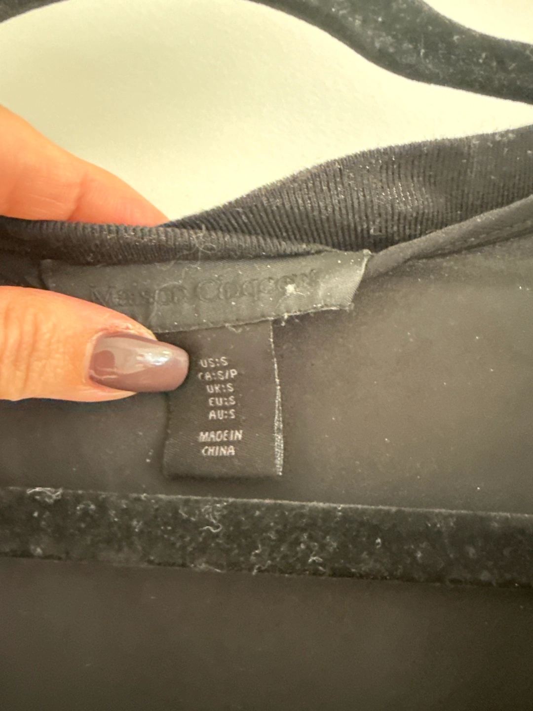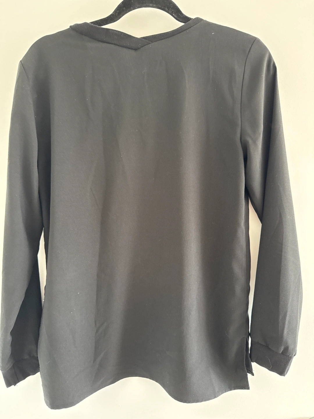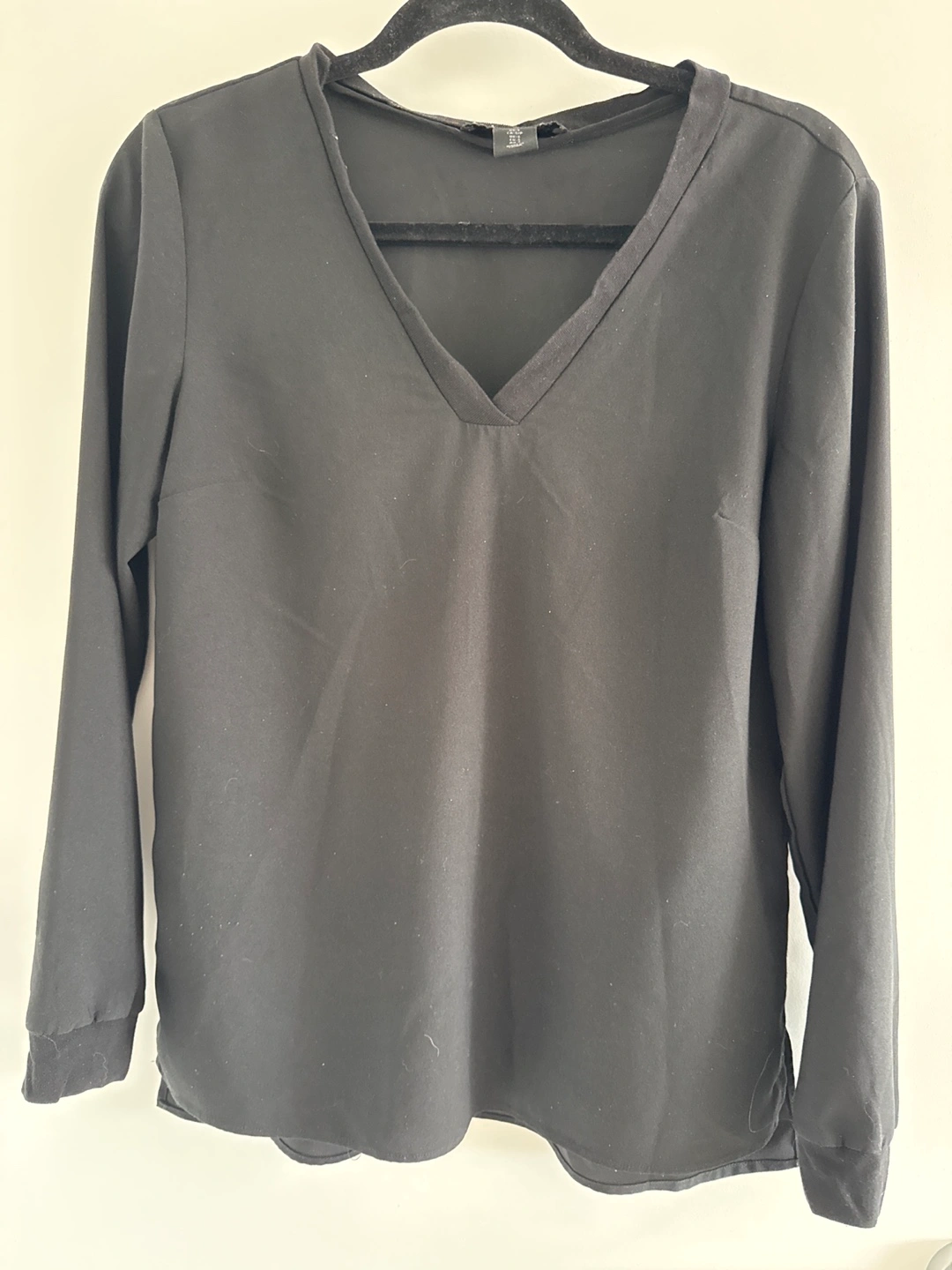 96Black long-sleeve blouse. V-neck design. Simple and elegant. Made in China.