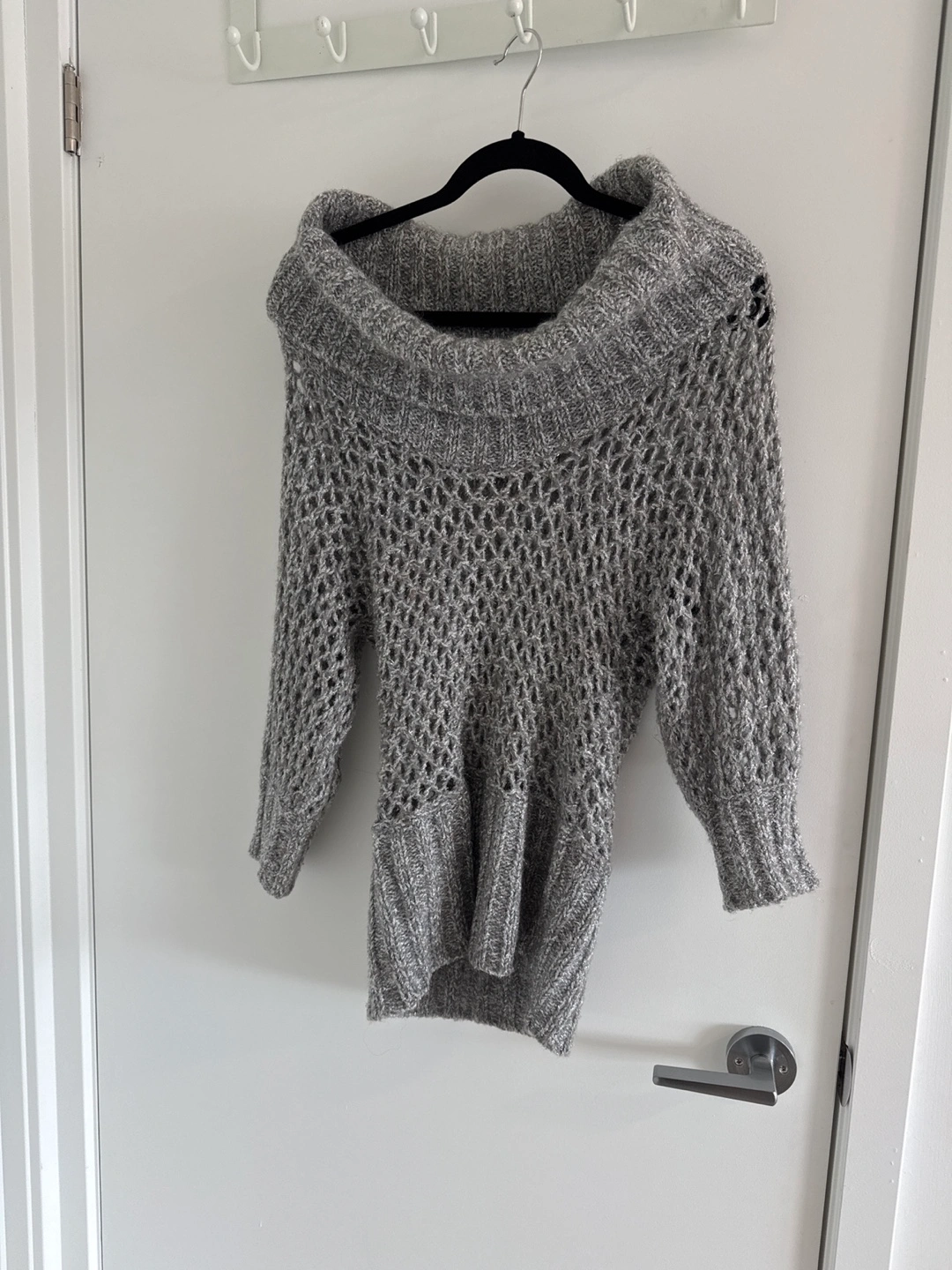 96Grey knit sweater. Cowl neck. Three-quarter sleeves. Open knit detailing. Excellent condition.
