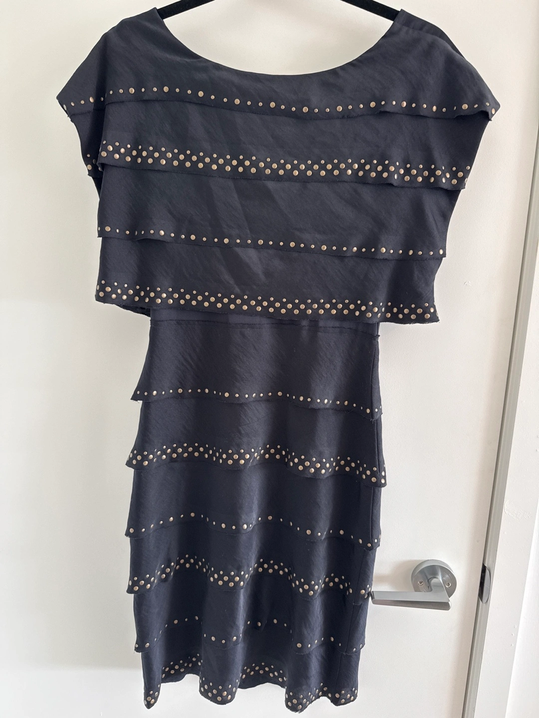 96Stunning black mini dress. Layered design with gold studs. Short sleeves. XXS size. Great for a night out.