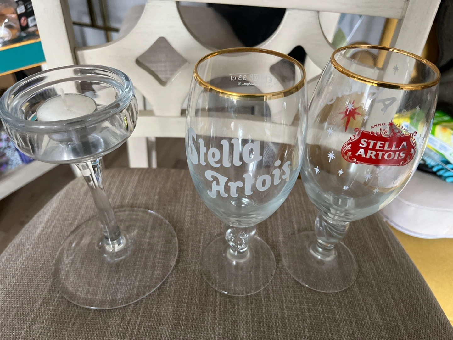 Two Stella Artois branded glasses, gold rimmed. One glass features a snowflake design. Clear glass crystal votive candle holder, small and elegant.