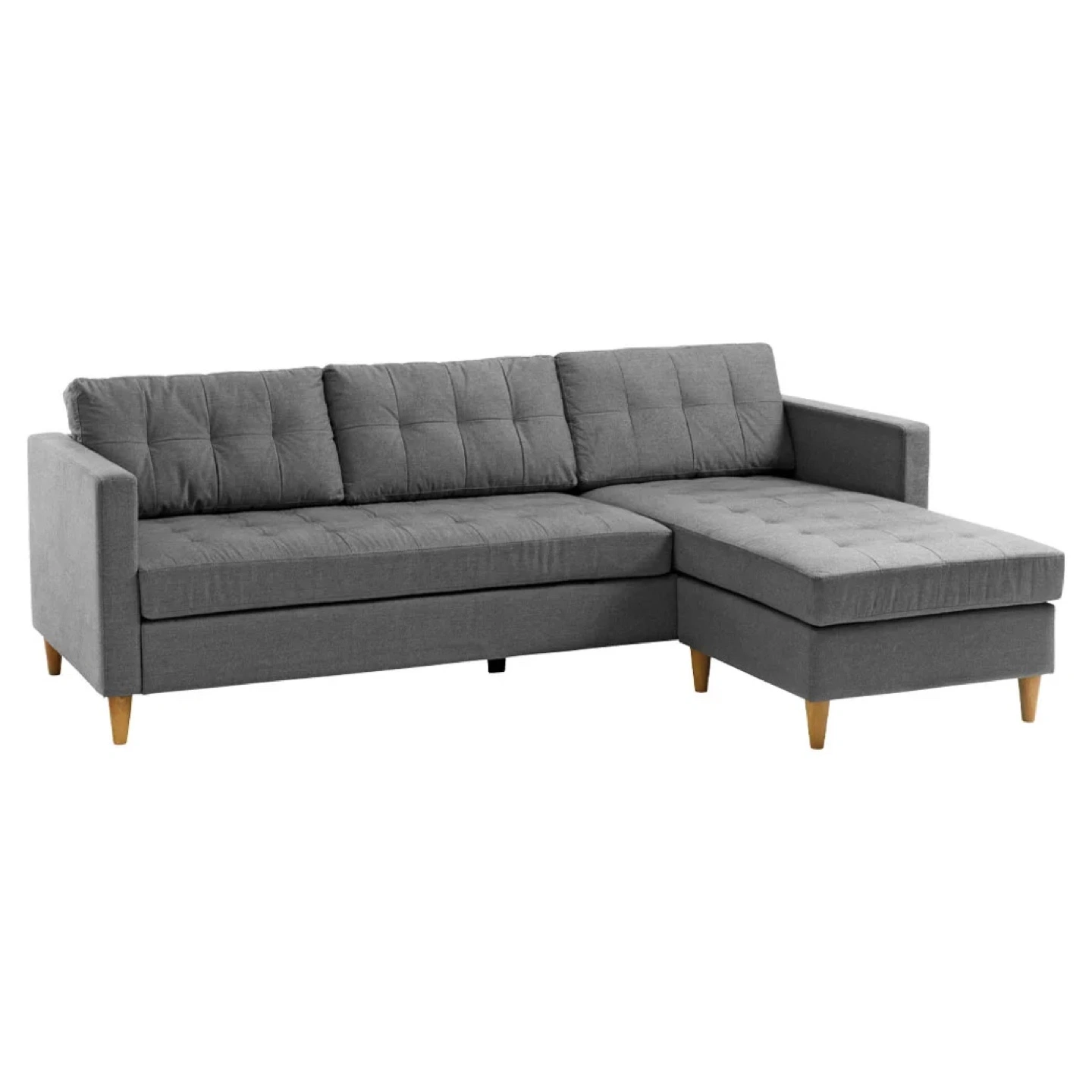 Selling a stylish and comfortable grey sectional sofa with a right-side chaise. Its clean lines and tufted cushions give it a contemporary look that fits perfectly into any home or apartment.