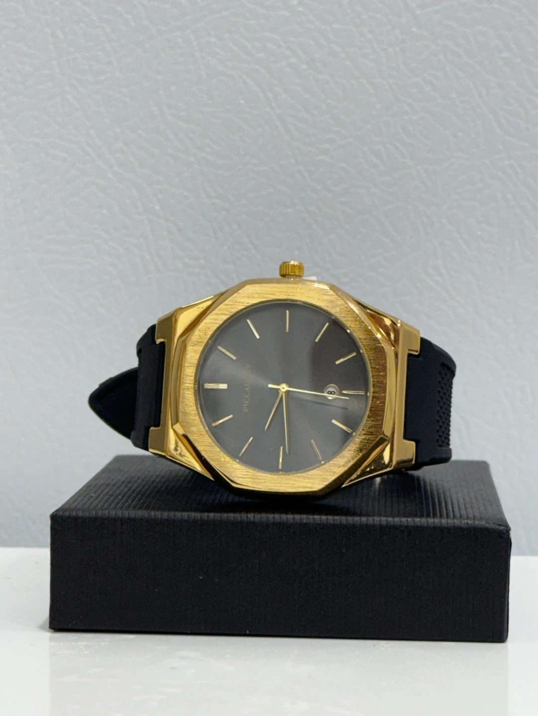 Two stylish watches. One black watch with gold accents and a black silicone band. One gold watch with a black silicone band. Both watches feature a unique octagonal design. Sold as a pair.
