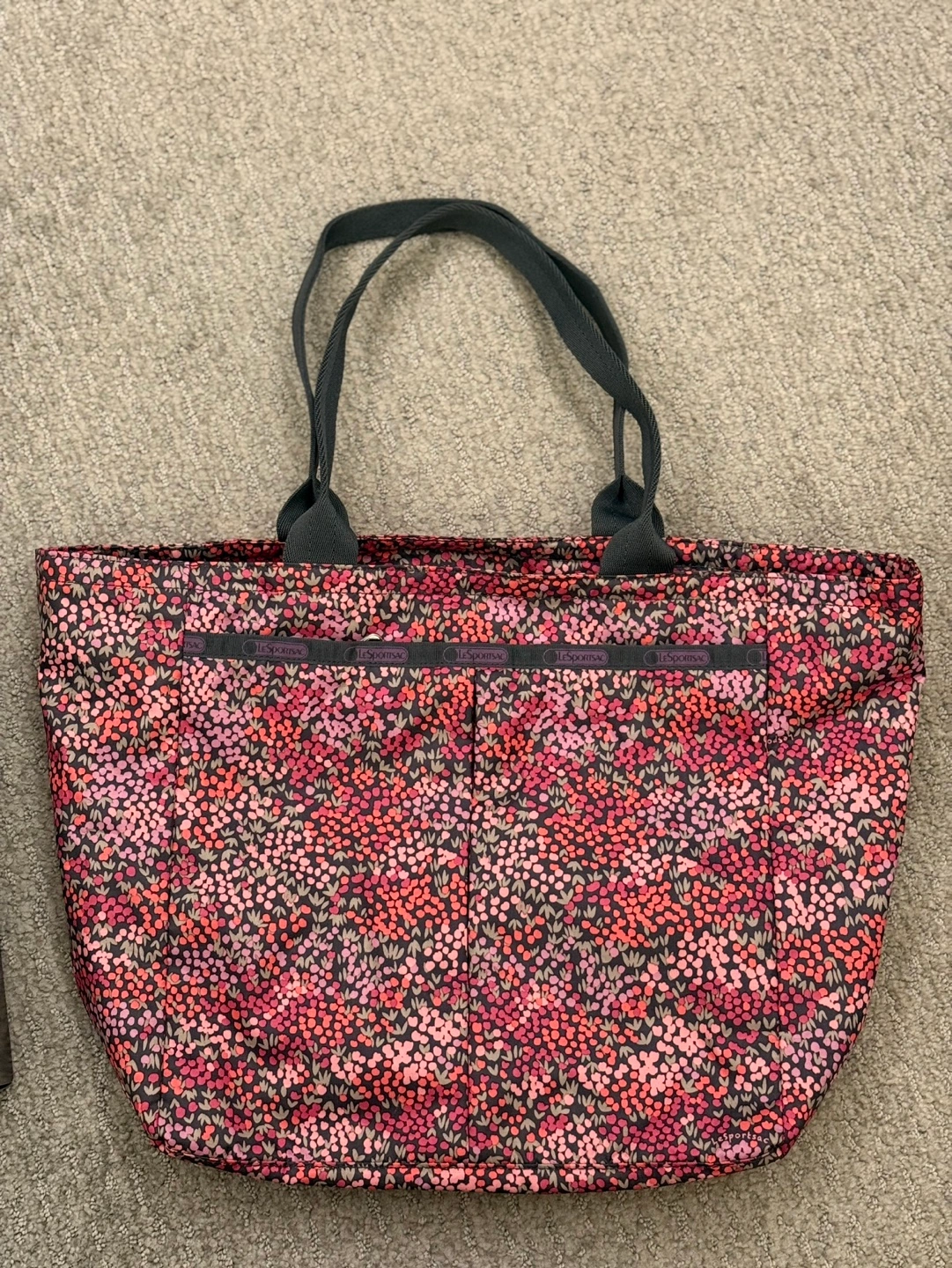 Large tote bag, floral print. Features two smaller zippered pouches inside. Black straps. Great for everyday use.