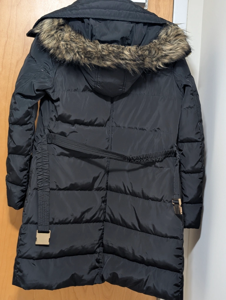 This elegant long black puffer coat is the perfect combination of warmth and style. Featuring a luxurious faux fur-trimmed hood, gold zippers, and a belted waist for a flattering silhouette, it’s ideal for cold weather. In brand new condition, this coat offers both comfort and chic winter outerwear.