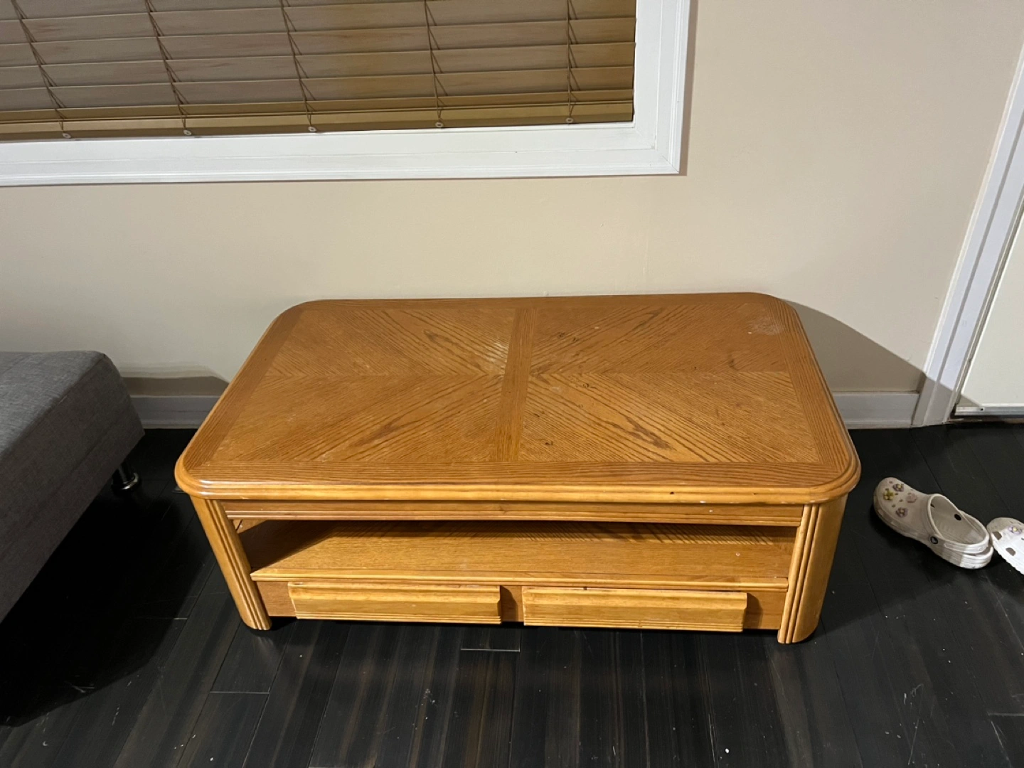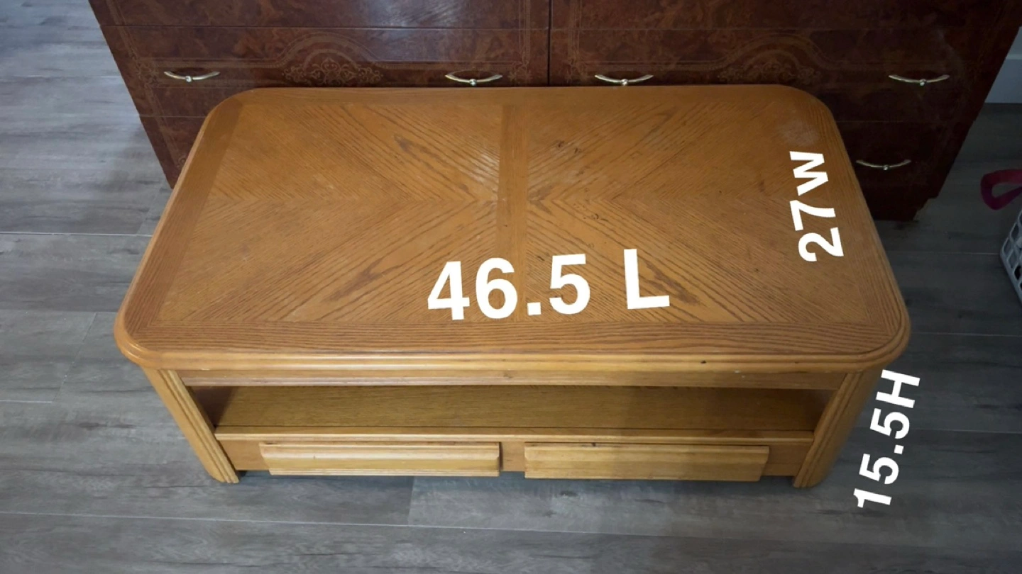 Solid wood coffee table. Two drawers and a lower shelf. Measures 46.5 L x 27 W x 15.5 H.