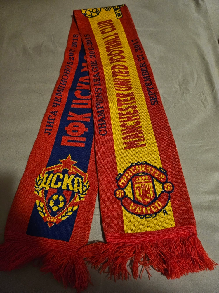 Rare Manchester United vs CSKA Moscow soccer scarf from their meeting from Sept 27 2017 during the 2017/18 Champions League group stage.