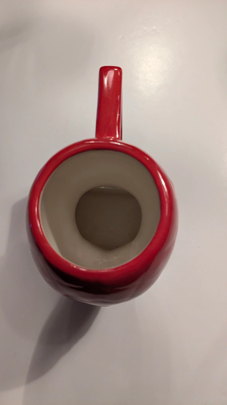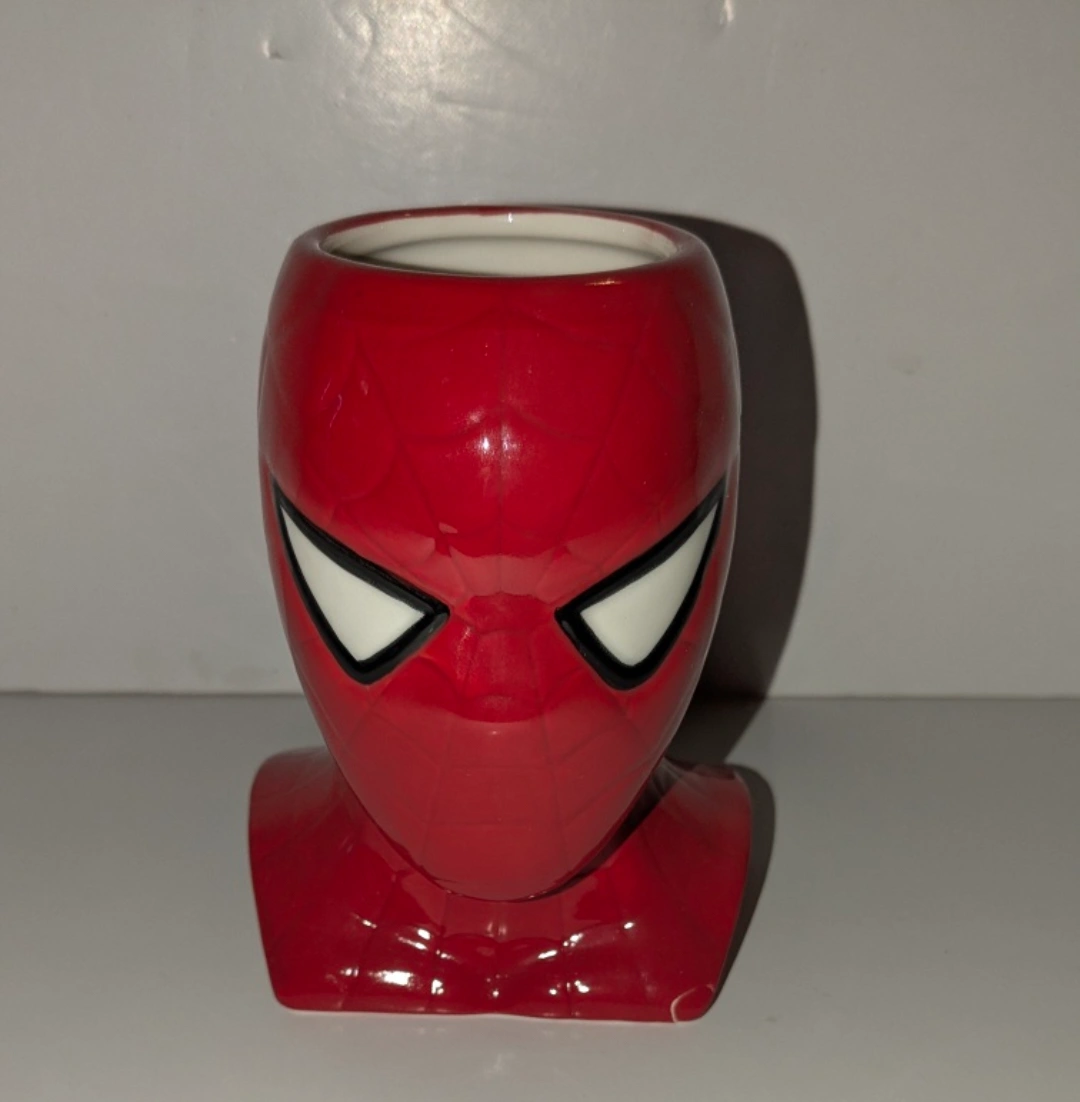 Red ceramic Marvel mug. Shaped like Spiderman's head. Features a handle. Great for fans.