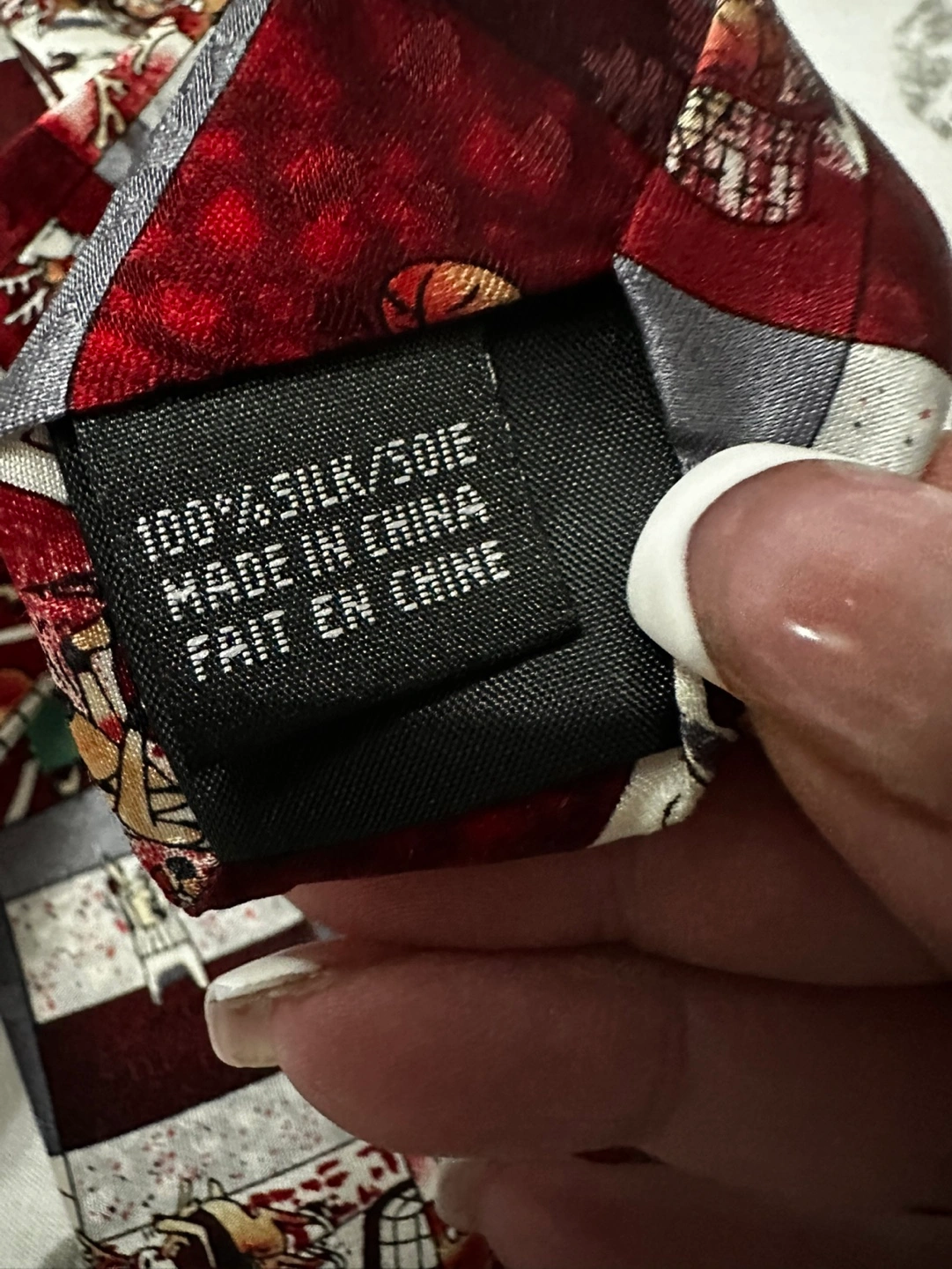 442Men's necktie. Features a repeating pattern of reindeer playing basketball. Red, grey, and white colour scheme. 100% silk. Made in China.