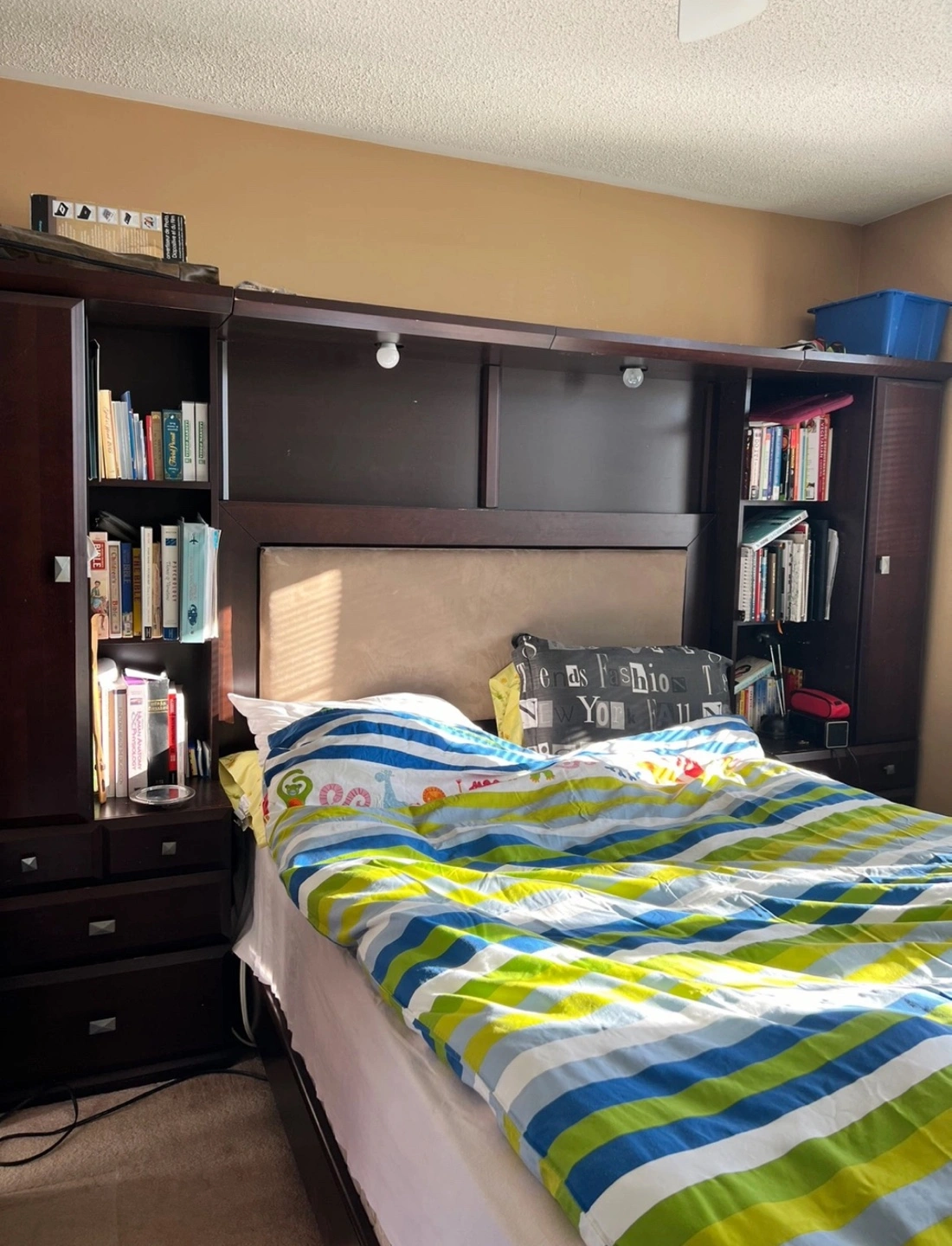 190Queen-size bedroom set. Dark brown wood finish. Includes headboard with integrated bookshelves and nightstands. Great storage. Shelves and drawers on both sides to store clothes and books Lights above bed on each side Can be delivered at an extra cost Can be dismantled Condition • Like new Dimensions • W: 110 inches H: 74 inches L: 83 inches
