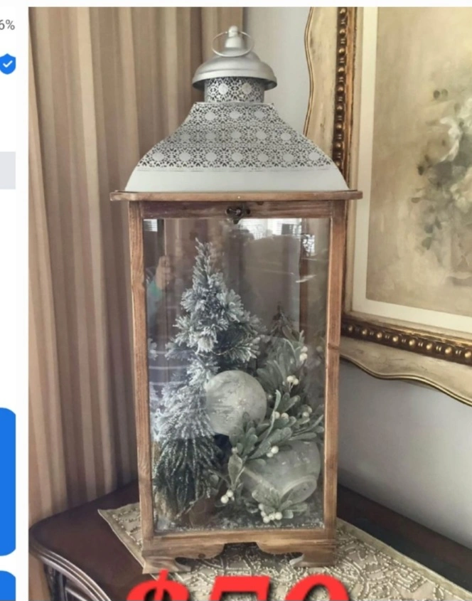 Large, rustic wooden lantern. Features a silver metal top with cut-out detailing. Glass sides showcase decorative items. Perfect for holiday decor or any events.