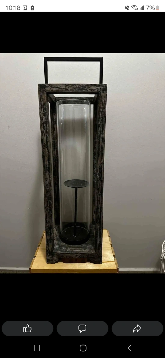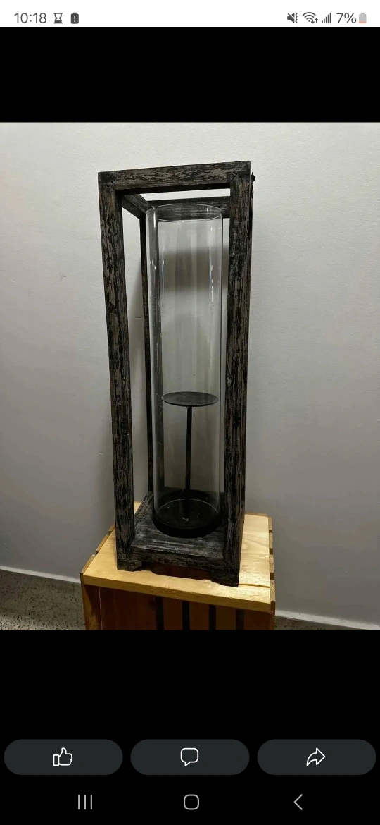Tall grey wood candle lantern. Glass cylinder insert. Black metal accents. Perfect for indoor or outdoor use. Great for adding ambiance to your home.