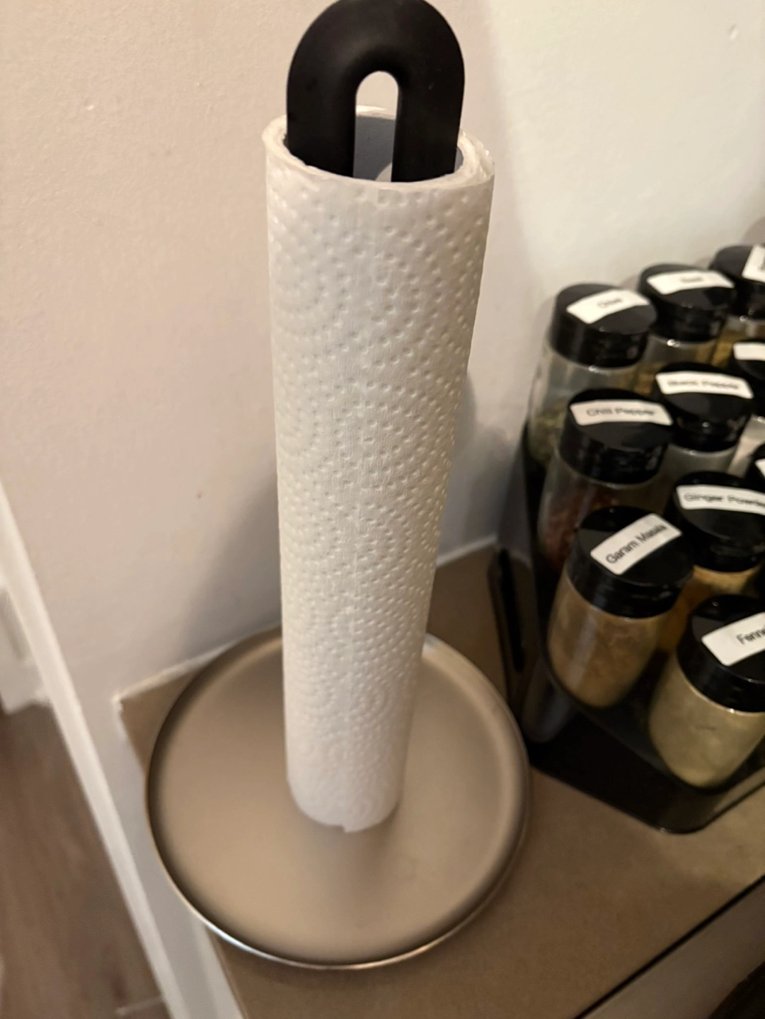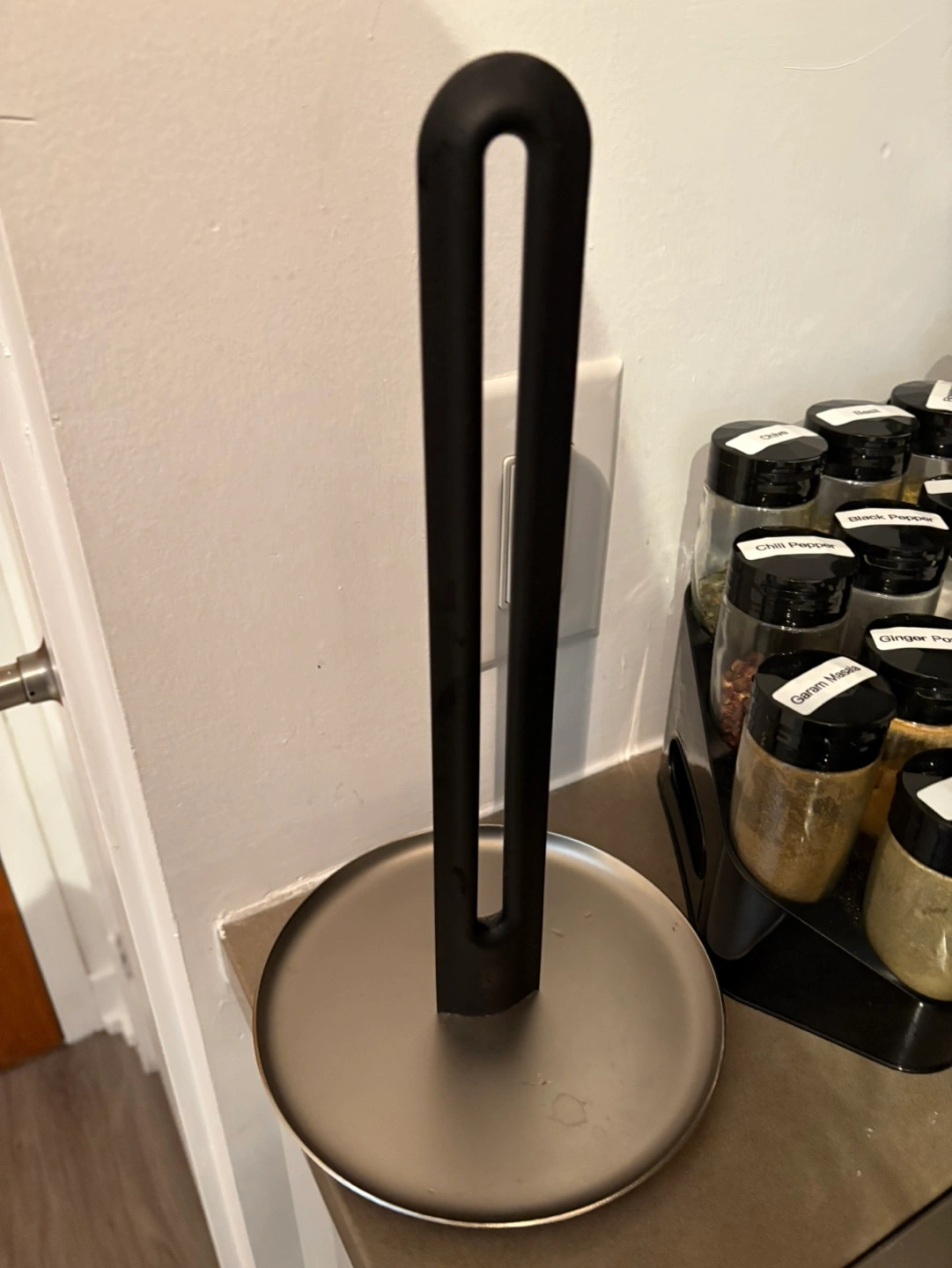 74Stylish and functional paper towel holder. Modern design. Metal base and plastic arm. Holds a standard roll.