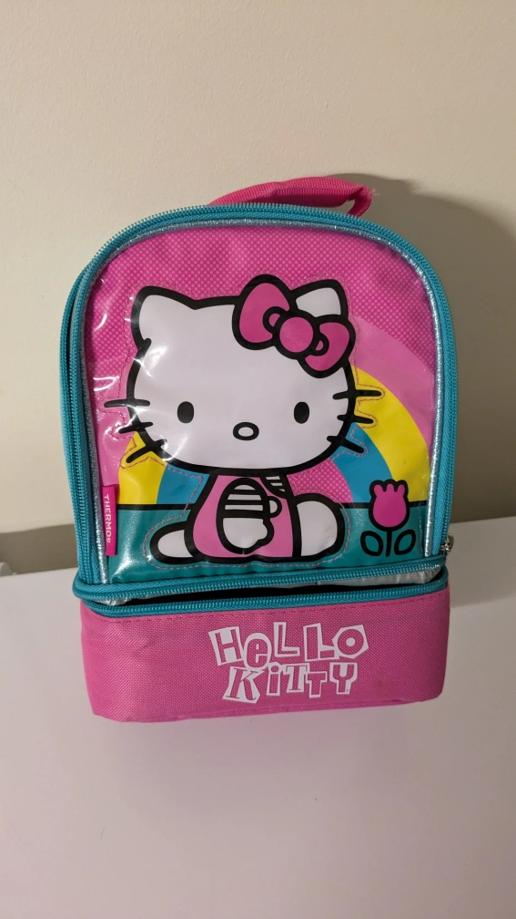 like new Adorable Hello Kitty lunch bag. Features a pink and teal colour scheme. Insulated interior. Top handle for easy carrying.