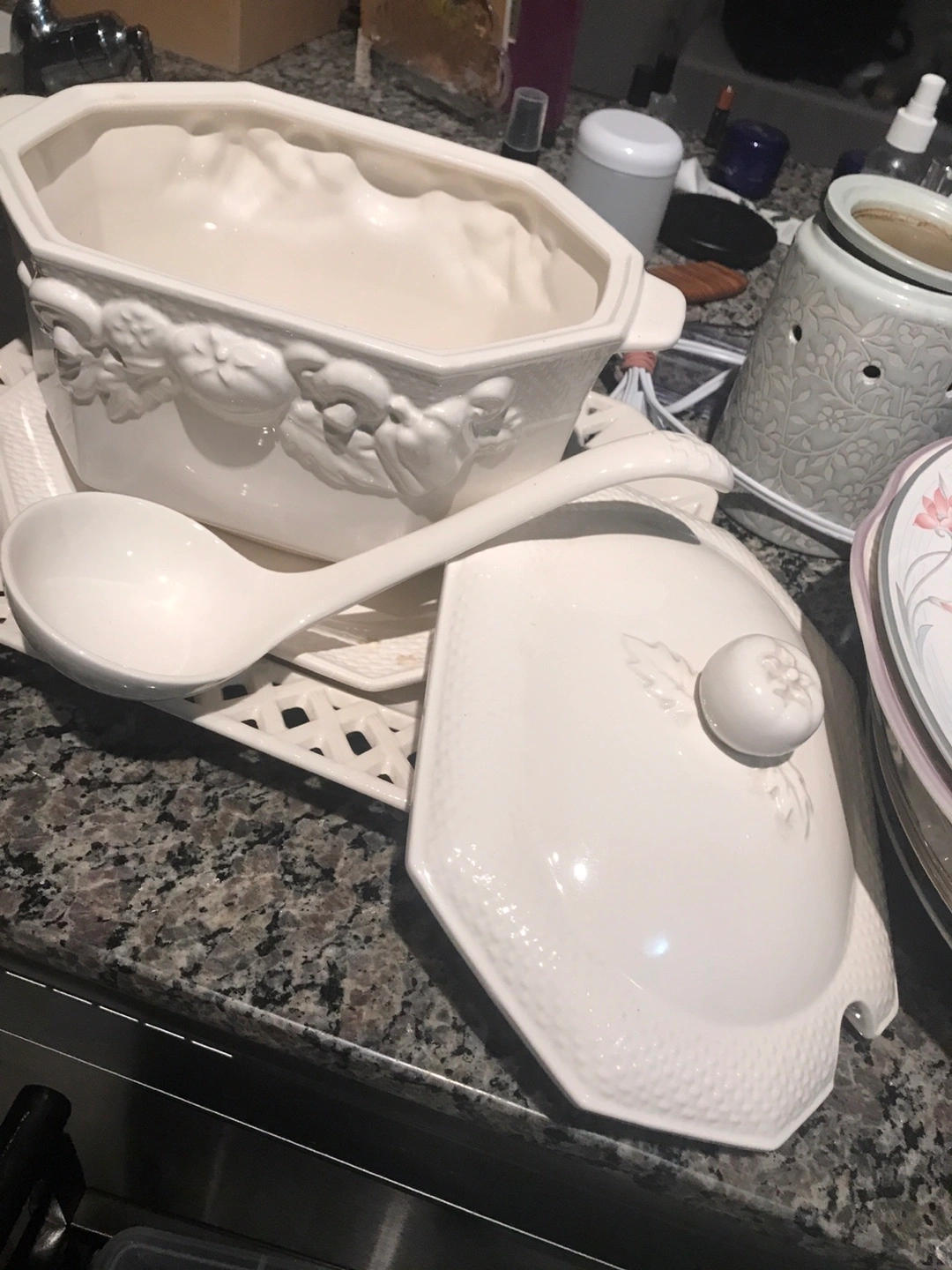Octagonal-shaped soup tureen. White ceramic with fruit and vine detailing. Includes a matching lid and ladle. Also features a coordinating serving tray. Great for serving soup or other dishes.