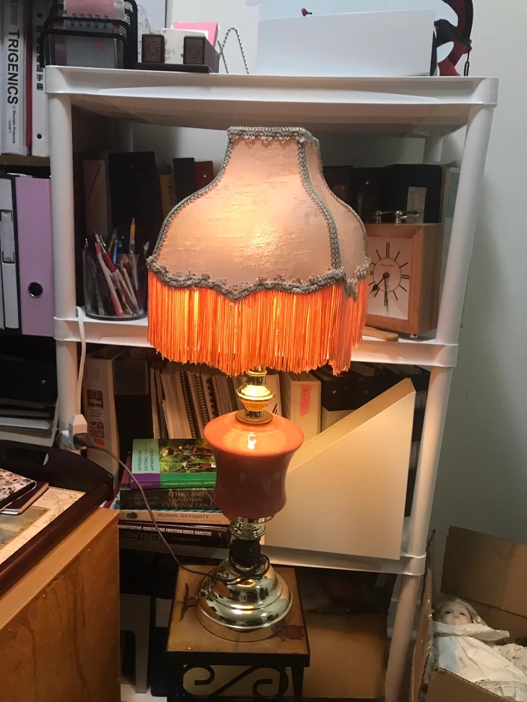 Set of two table lamps. One features a beige shade and brushed silver base. The other boasts a pink base and a fringed beige shade. Both are in used condition, selling as is.