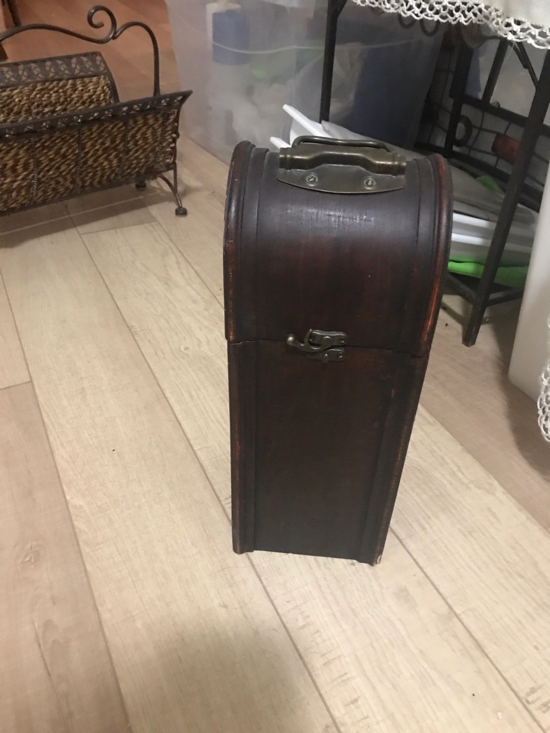 Vintage-style dark brown wooden wine carrier. Features a hinged lid and a carrying handle. Also included, a light-coloured wooden organizer with six small drawers. Ideal for small items storage.