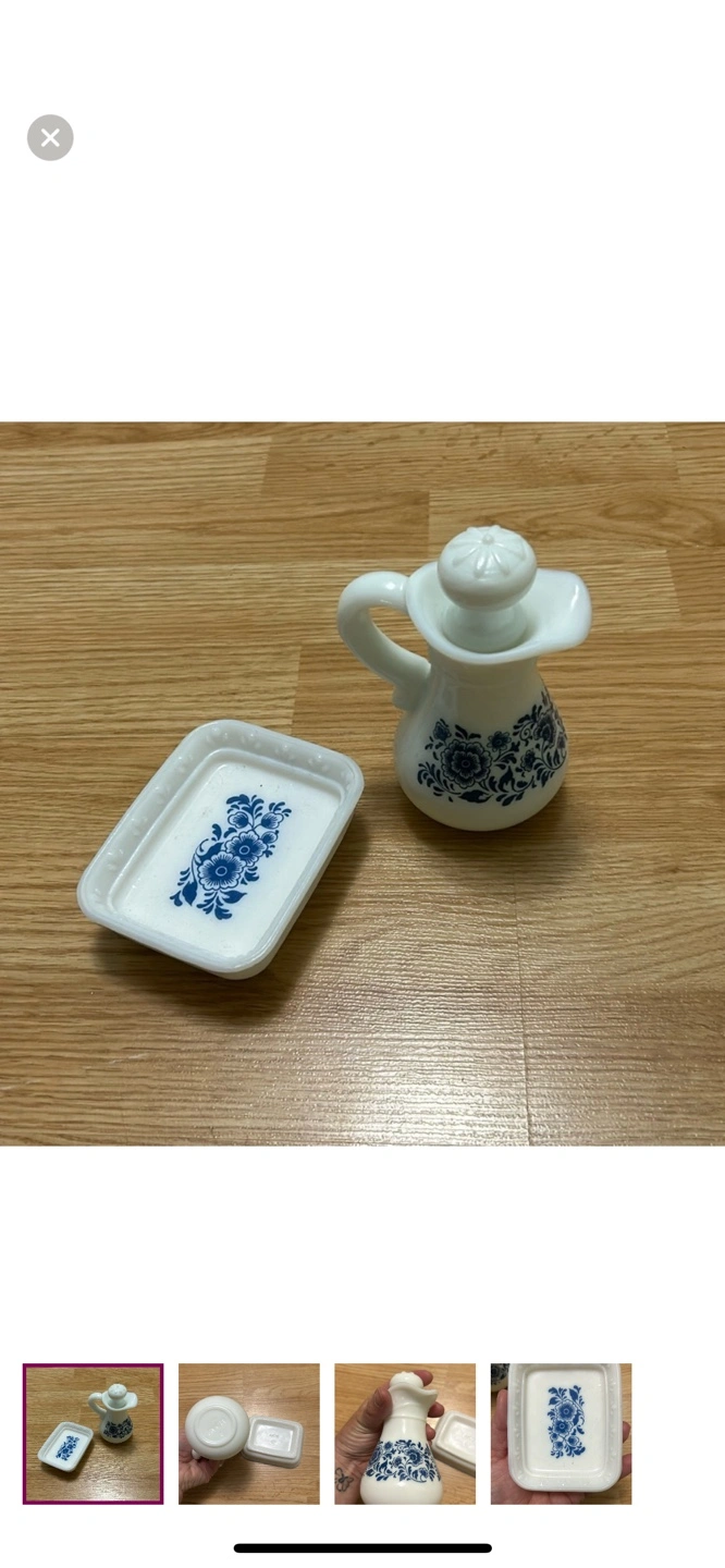 Cute vintage milk glass oil and vinegar set. Features a small jug with a lid and matching soap dish. Blue floral pattern. Perfect for your kitchen or bathroom. Avon.